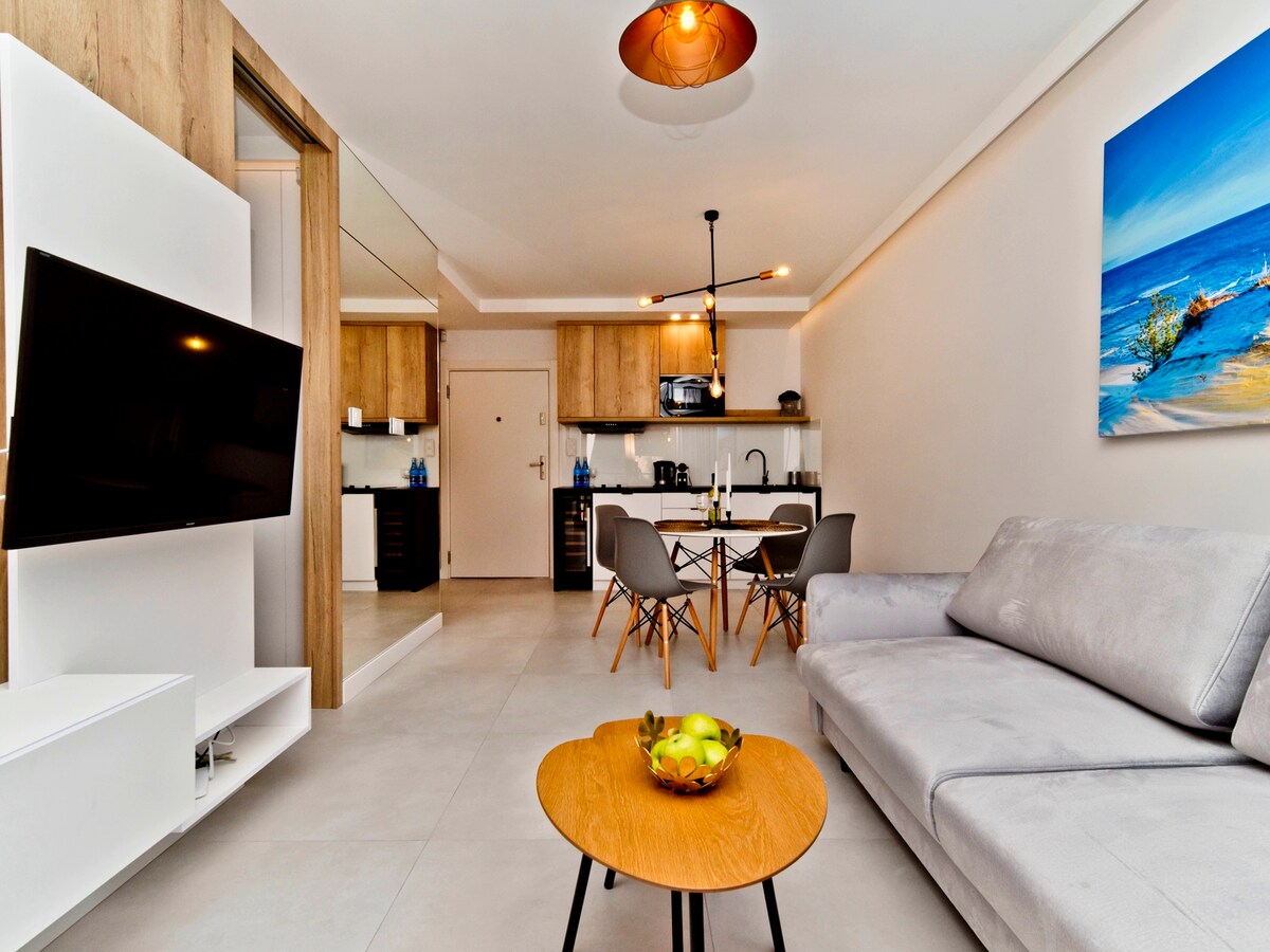 Zapraszam do stylowego apartamentu położonego w samym sercu perły polskiego wybrzeża. Nasi Goście znajdą w nim wszystkie nowoczesne udogodnienia jak zmywarka, 50" smart tv, soundbar, zamrażarkę, itp. Apartament usytuowany jest w centrum Juraty w pobliżu plaży i promenady. Klimatyzowane wnętrza pozwolą złapać oddech, a zadaszony, otulony zielenią taras zapewni chwile relaksu. Dla małych dzieci możliwość dostawienia łóżeczka. Serdecznie zapraszam :)
