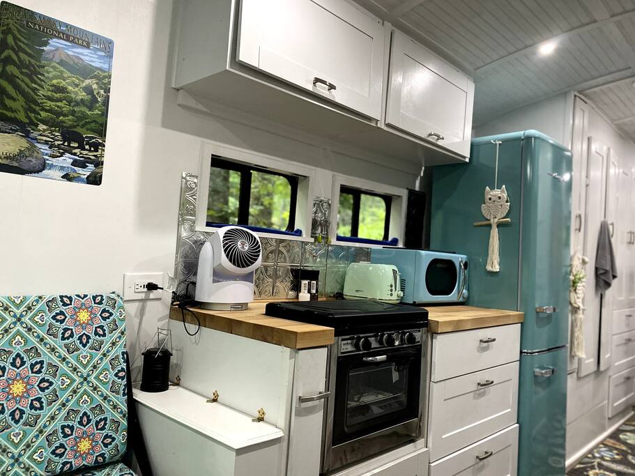 ¡Big Blue, el autobús está todo decorado y listo para organizar tu próxima escapada romántica de glamping en las Grandes Montañas Humeantes! Este hermoso "skoolie" de tamaño mediano está estacionado permanentemente en nuestra propiedad de 5,5 acres en la montaña inglesa, rodeado de árboles y vida silvestre, y a pocos pasos de un arroyo burbujeante de temporada con pequeñas cascadas. Tiene todo lo que podrías desear para una escapada en pareja, rodeado de la madre naturaleza, con todas las comodidades que necesitas además del aire rústico de acampar en gran estilo. Esta propiedad está muy boscosa. El estacionamiento está en un estacionamiento de grava a unas 30 yardas del autobús. Hay un carrito de equipaje con ruedas disponible para ayudarte a llevar tus cosas al autobús por el camino iluminado. El techo del autobús se ha elevado a 18pulgadas, por lo que la altura interior es cómoda para cualquier persona de hasta 6'5 "más o menos. Cama tamaño queen, ducha, inodoro, comedor, sofá, cocina completa. Te invitamos a caminar por toda la propiedad de 5,5 acres. Probablemente sería útil para ti obtener un recorrido rápido por el autobús y lo que está disponible para ti y cómo trabajar ciertas cosas, pero si prefieres tu privacidad, hay una carpeta en el autobús con toda la información. ¡Avísame por mensaje si quieres que te dé el recorrido! Esta propiedad está junto a una carretera privada de grava compartida por 3 vecinos. Todo el mundo es reservado y disfruta del ambiente tranquilo de la montaña inglesa. La carretera no está pavimentada, pero puede ser utilizada por cualquier tipo de auto sin ningún problema. La grava se prepara con regularidad.