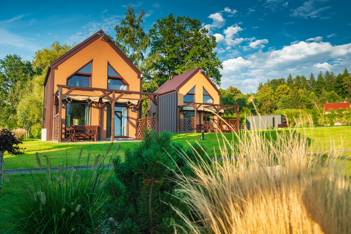 La base es 3, casas totalmente equipadas con una superficie de 50 m2 + entresuelos cerrados. La planta baja de cada casa es una sala de estar con cocina americana y un patio de 18 metros, un dormitorio con cama doble y baño. Hay dos camas individuales en los entresuelos. El número óptimo de huéspedes en la casa es de 4 personas, un sofá cama en la sala de estar puede proporcionar alojamiento para 2 personas adicionales. Tlen es un refugio durante todo el año. En invierno, climatizado, aire acondicionado en verano. Para descansar y descansar.
