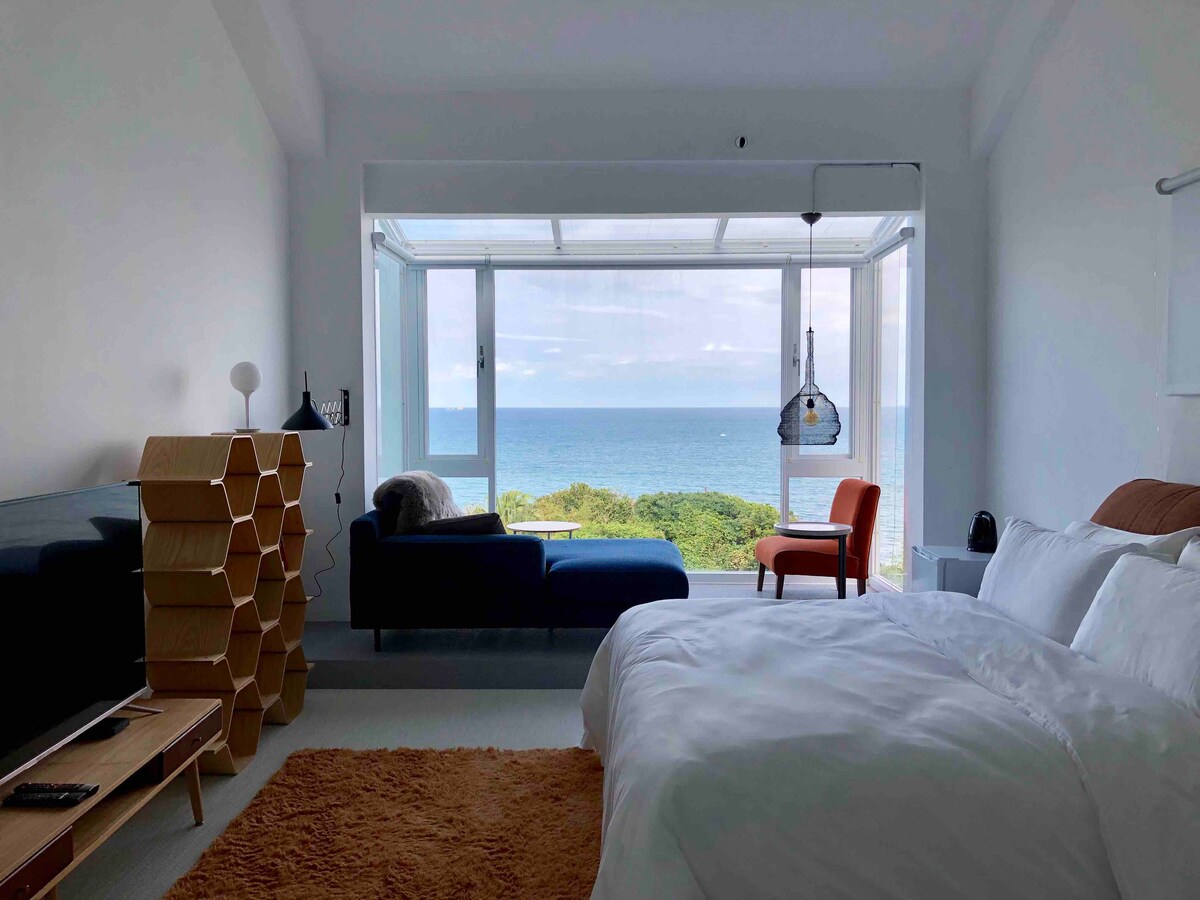 這是全台灣最美的海景民宿。 四季變幻的遼闊景觀,居高俯瞰180度的太平洋,面對著正東方,是太陽及月亮升起的海面,充滿正向希望的夢幻之地。 台灣黑騖家族窗前翱翔,偶爾駐足前方樹梢與你對看。漁船由右方的磺港出發,載著任務與期待,向無邊際的未來出發。夜晚,遠方成排的白帶魚漁船閃著燈光,若隱若現像極了一條不存在的海上公路。深邃的海反射出來的光,在寂靜夜裡,成了非常不真實的場景。 每年4、5月,全世界僅存4艘的蹦火船,捕魚範圍就在民宿正前方海面上。蹦出火光的那一霎那,海面像打著閃電,轟隆一響,萬魚躍出海面。 海濤聲、山林風動、蟬鳴鳥叫、進入耳蝸,請閉上眼,你儼然漂浮在台灣島的上升氣流中,俯瞰著這美麗島嶼的山與樹與海,還有那居住在這島上可愛的人與動物。 歷經八年改造,拿掉所有的設計元素,只留下屬於這塊土地的,屬於海的。 戶戶落地大面海景窗,私人客廳。一樓房型設有柴火壁爐(須加購)。 距離金山市區10分鐘車程,距中角灣國際衝浪基地4分鐘車程,距北海高爾夫球場5分鐘車程,距朱銘美術館、鄧麗君紀念公園15分鐘車程。 金山老街眾多美食,肉包王、鵝肉、都是必嘗的經典。