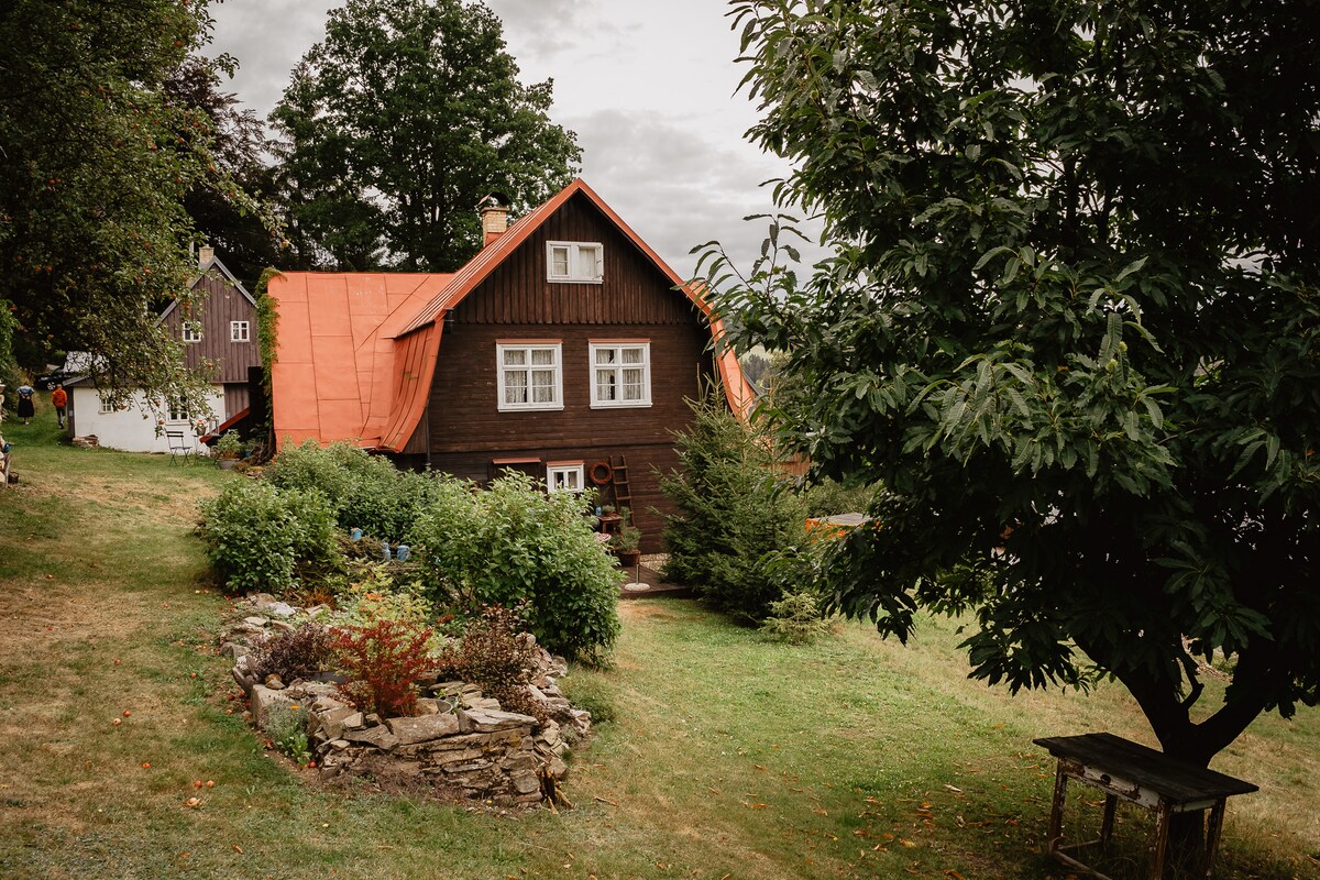 Esta casa de campo decorada con encanto, precalentada en invierno, con tres amplias habitaciones - una con chimenea - todas con calefacción eléctrica - ofrece tranquilidad y es un lugar ideal para familias con niños o amantes del arte y la naturaleza. Se encuentra cerca de pintorescas ciudades de montaña (Jilemnice, Semily, Vrchlabí) y numerosas estaciones de esquí, incluyendo Sněžka, el pico más alto de la República Checa. A 30 km de la ubicación se encuentra la reserva natural Český ráj, que ofrece una variedad de hermosas experiencias de senderismo, escalada y rafting.