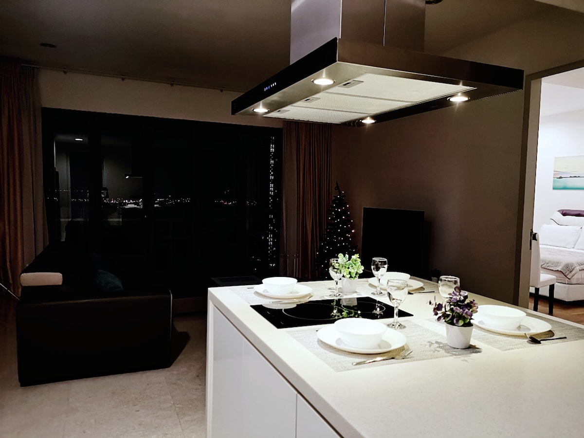 Este es un espacioso alojamiento de 2 dormitorios perfectamente apto para huéspedes de hasta 5 personas con un total de 1 cama tamaño king, 1 cama tamaño queen y 1 cama individual. Planta alta con vistas altas. 1. Cancha de baloncesto 1. Gimnasio 2. Salón de actos 3. Salón 4. Biblioteca 5. Tienda de manicura 6. Miniteatro 7. Zona de barbacoa 8. Piscina 9. Sauna 10. Jacuzzi 11. Sala de juegos (mesa de billar, sala de PS, dardos y más) 12. Lavandería 13. Minimercado - Jardín en la azotea. Los huéspedes no pueden fumar en la habitación, por favor, fuma en el balcón si es necesario.