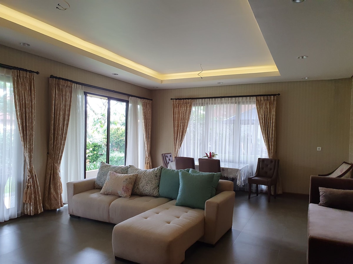 This villa has a kitchen for simple cooking, stove, gas, electric pan, refrigerator, and dining area. A large bedroom with private bathroom, TV and dvd player in the living room area. It is walking distance to a Club House that has a large gym, swimming pool, jacuzzi, convenient store. There's also Pullman Hotel and Indonesian food restaurant (Bumi Sampireun) next to the Club House. Enjoy the fresh air and beautiful scenery (flower garden, and deer park) it is monitored by security guards 24hr.
