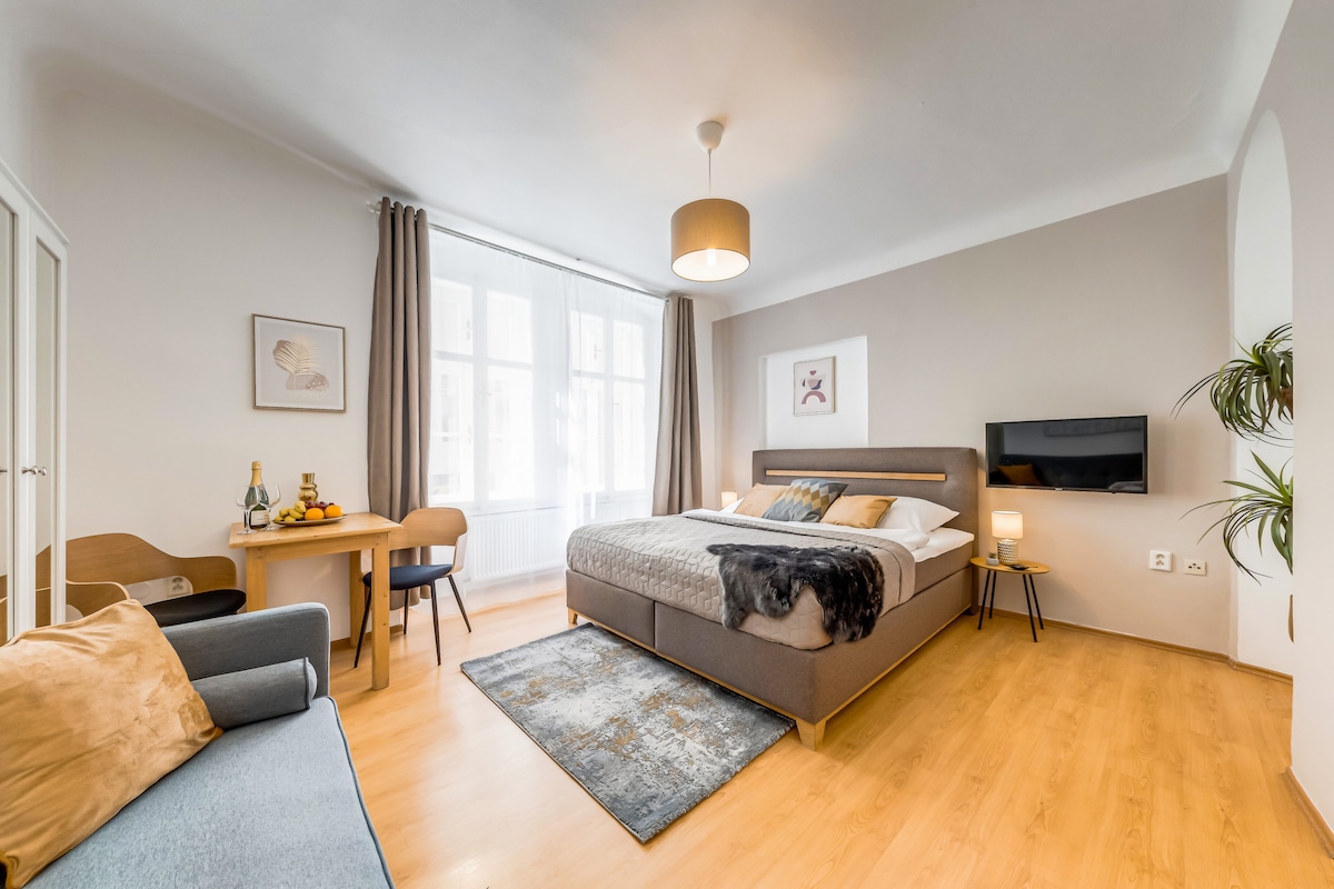 Discover our cozy apartment in the heart of Prague. This two-room apartment accommodates up to four guests, making it ideal for a family or friends. The cozy bedroom features a queen-size bed, while the second room, with a kitchen and dinette, offers a comfortable sofa-bed. Forget about public transport, you'll be enveloped by the city's most iconic landmarks, including The Old Town Square or Prague Castle. Explore the city with ease from this central, well-appointed base.