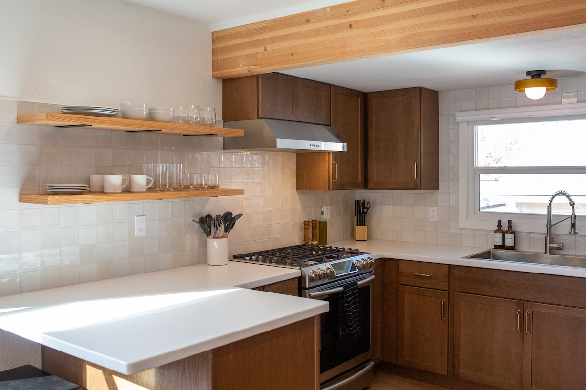 Enjoy open space to cook in a family room to gather in & a patio for air Self check in keypad. Remodeled, top to bottom fresh. Sunlight filled space, big windows face E-morning light & W-sunsets, airy & modern. Blackout blinds in bedrooms. Clean simple design, open floor plan & hard surface flooring throughout with no carpet, area rugs in rooms. Finished small garage on request. 3+ parking spaces: driveway 1, and 2 curb. Fenced & private backyard with patio, table, chairs.