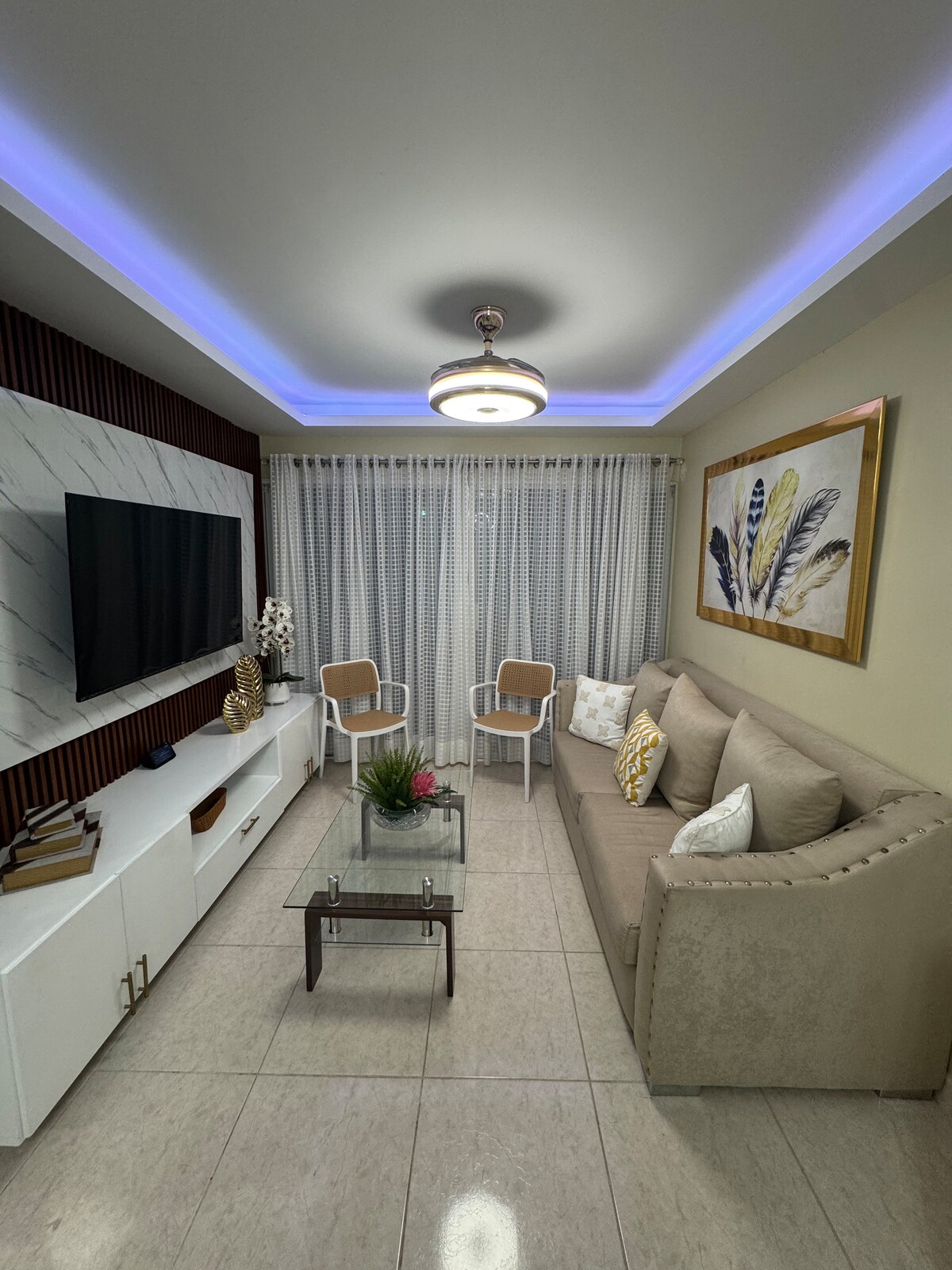 Te invitamos a relajarte y disfrutar en pareja o familia en este moderno y cómodo apto ubicado juan López , Moca. Espacio 3 habitaciones, habitación principal king size y closet y baño. 2 habitaciones queen size. Sala con TV, Wifii, comedor, cocina y balcón con vista a la Piscina. 2 parqueos, espaciosa área de recreación con piscina y gym.