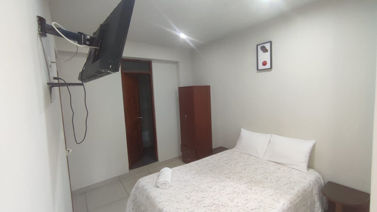 Acogedora habitación en el segundo piso del Hotel Sueños – Huancayo Disfruta de una estancia cómoda en esta habitación totalmente amoblada, ideal para sentirte como en casa. Cuenta con una cama de dos plazas, TV con Netflix, baño privado con agua caliente y una kitchenet equipada con cocina eléctrica, licuadora, menaje básico y todo lo necesario para preparar tus alimentos. Perfecta para quienes buscan comodidad, privacidad y una excelente ubicación.