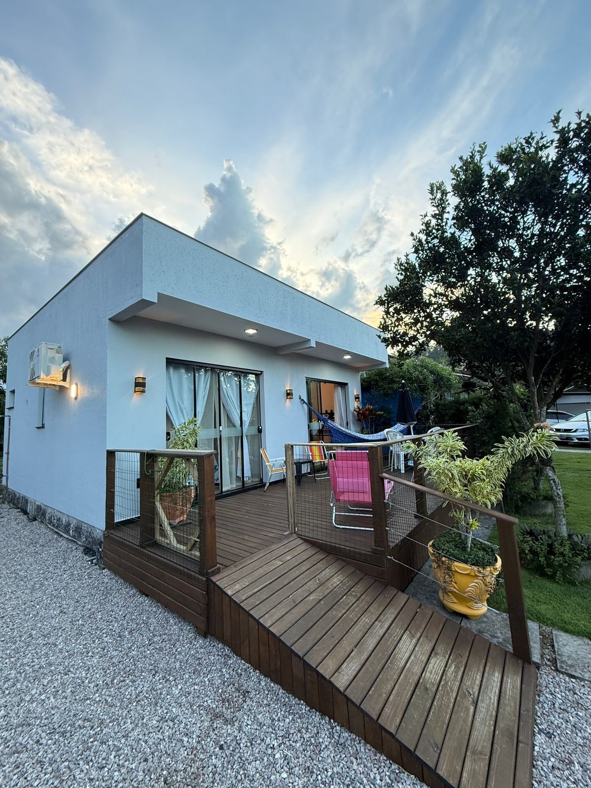 Casa en Jurere, 3 dormitorios, 1 suite y “+1 dormitorio” adicional con litera que está detrás del armario verde. (total 4 dormitorios). - 1 cama king, 2 camas dobles, 1 cama individual, 1 litera, “2 colchones individuales adicionales” - Aire acondicionado en todas las habitaciones y en la sala de estar - “Piscina” con 6 asientos y una tumbona - Plaza de aparcamiento para 2 coches - TV por cable de 70 pulgadas (NET) y Wi-Fi de 60 megas (NET) - puerta electrónica y alarma - 350 m del mar