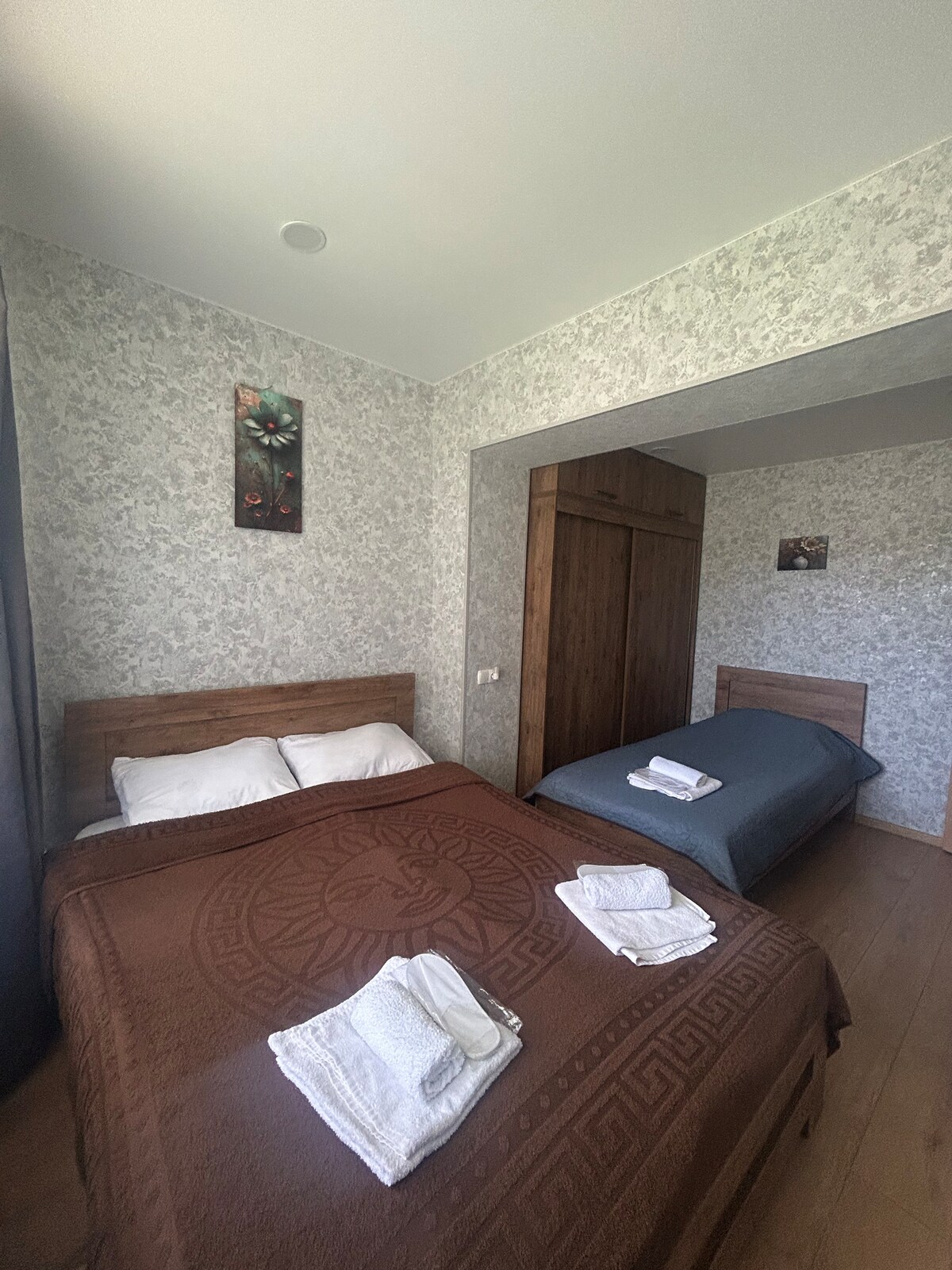 Newly renovated modern and comfortable apartment located in 'Nadzaladevi' district (Tornike Eristavi Street), near the 'Didube metro station and Kikvidze' park ('Veterans Square '). equipped with all necessary amenities: central heating, free WIFI and TV, kitchen, fridge, microwave, stove, shower, toilet, hygiene items, hair dryer, towels, bedding. A separate bedroom with a double-sized bed to ensure good rest and sleep. wardrobe and scales. Hope you will have a good time in Tbilisi