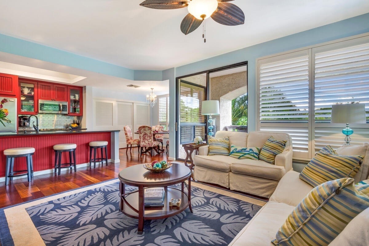 Hale Kapena (Captain's House) es un bonito apartamento frente al campo de golf con vistas al océano. Esta acogedora unidad cuenta con un dormitorio completo y una segunda zona de descanso convertible en el área de la sala de estar. Ideal para invitados o niños. Esta unidad en la planta baja ofrece un fácil acceso con una plaza de aparcamiento reservada. También se puede solicitar el registro de entrada anticipado o el registro de salida después de la hora establecida, si están disponibles, por un suplemento.