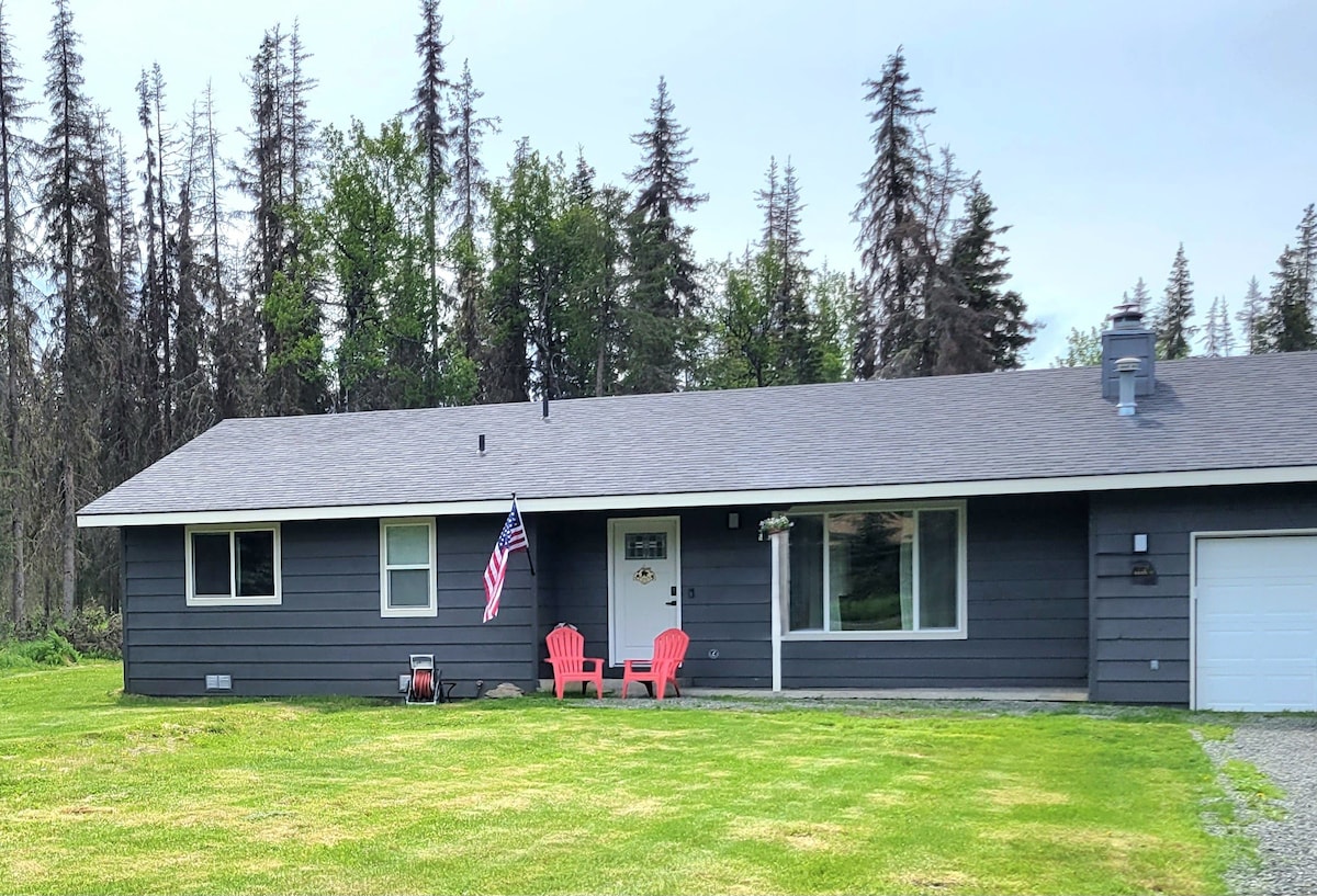 4 Bears is a comfy 1-acre hideaway at the end of a quiet lane. 3 Bedroom & 2 Bath one story home, plus a den w/ full bed, perfect for families & fishing trips. Just 10–15 mins to the Kenai River. Kick back on the deck, fire up the grill, and warm up by the fire pit (we’ve got the firewood and hot cocoa!). Garage for your gear & chest freezer for your catch. Games, cards, & cornhole. Need an extra bed? Twin rollaway is great for a kid or teen!