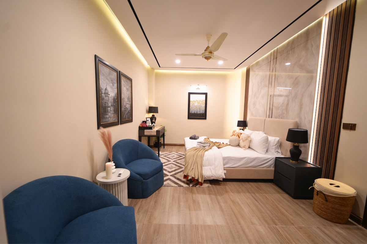Welcome to your perfect getaway! Bright modern 1-bed apartment — ideal for business or short stays. Fast Wi-Fi, self-check-in, safe building with parking. 10–15 min to Bahria Town & main shopping. What You’ll Love: Modern & elegant interiors Cozy living space with smart TV & high-speed WiFi Comfy King-sized bed for a restful sleep Clean small bathroom with essentials provided Secure building with easy access to top attractions Book now and experience comfort, convenience, and style!