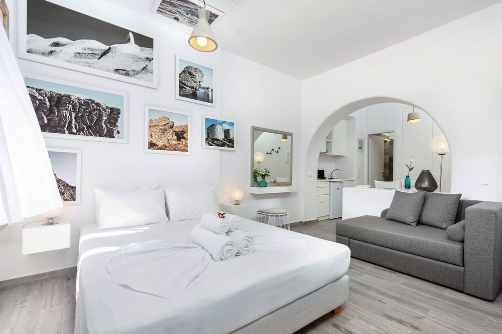 Habitación espaciosa recientemente renovada con baño privado, cama tamaño queen con colchón de 30 cm, televisor Samsung de 43 pies, secador de pelo y hervidor de agua para té/café. ¡Estos son apartamentos con servicios, limpiados diariamente! ¡Estamos ubicados en Kardamena a 200 metros de la playa y a poca distancia de los bares y restaurantes! Disfruta de la comodidad y el fácil acceso a todo desde este lugar céntrico.