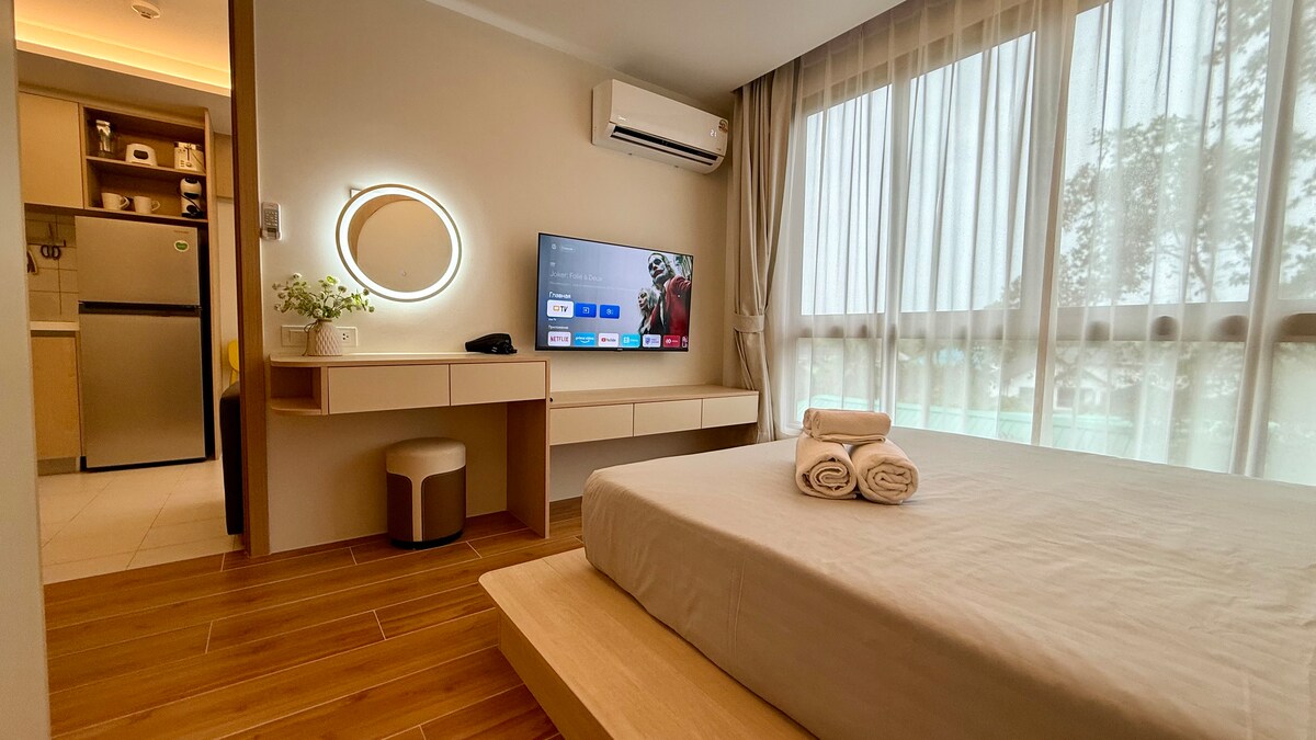 ✨ Ваш островной оазис у пляжа Камала (всего 800 м)! Апартаменты с уютной спальней, рабочей зоной и полностью оборудованной кухней (кофемашина, техника, посуда). Ванная и диван-кровать создают комфорт для всей семьи. На крыше — два бассейна с панорамой на горы и море, современный спортзал и коворкинг. Идеальное место для отдыха, работы и полной перезагрузки в живописном уголке Пхукета 🌴