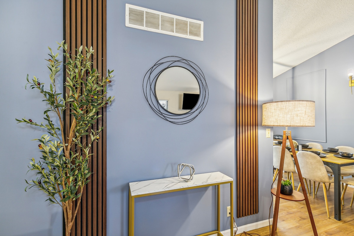 Un divertido refugio moderno para sentirse como en casa y relajarse. Con 3 cómodos dormitorios, pueden dormir fácilmente 8 personas e incluso relajarse y disfrutar de películas o juegos en la gran pantalla de cine. Cerca de Top Golf, restaurantes y a pocos minutos del Centro de Convenciones de Overland Park, nuestra casa tiene fácil acceso a la autopista. Disfruta de los campos de golf cercanos o de las atracciones locales. Muebles modernos y elegantes llenan la casa, incluyendo lujosas camas, lujosas sábanas, cocina equipada, un lavadero completo y wifi de 1 Gb para trabajar o transmitir.