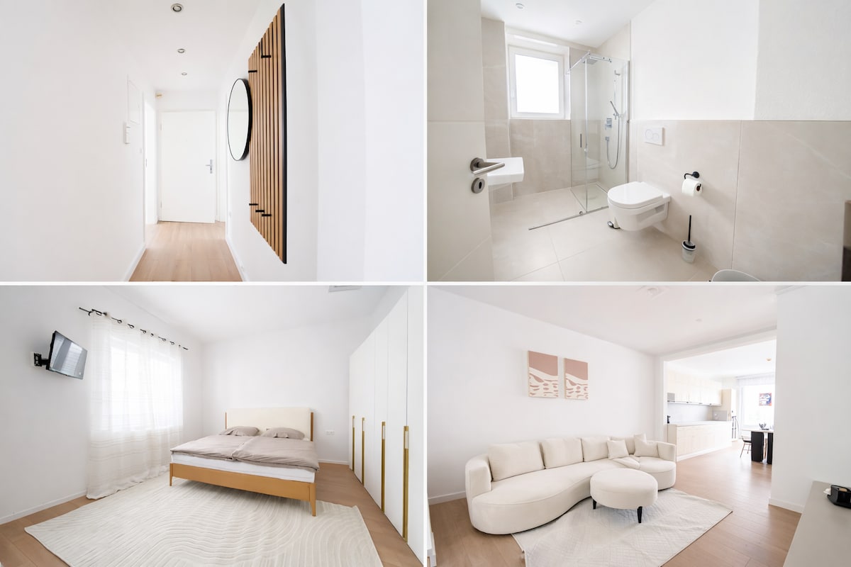 ¿Estás buscando el lujo perfecto con tu propio balcón, una vista sobre las azoteas de Karlsruhe y un servicio similar a un hotel? ¡Entonces te sentirás como en casa en este acogedor apartamento! El departamento es totalmente equipado con cama grande y gimnasio en la casa. Llegada ➤ autónoma 24/7 con código PIN. ➤ Cocina totalmente equipada + máquina Nespresso y cafetería. WLAN ➤ rápida (> 100 MBit/s) TV 4K➤ Ultra-HD con Netflix ➤ Relajante ducha con efecto de lluvia Estacionamiento➤ subterráneo