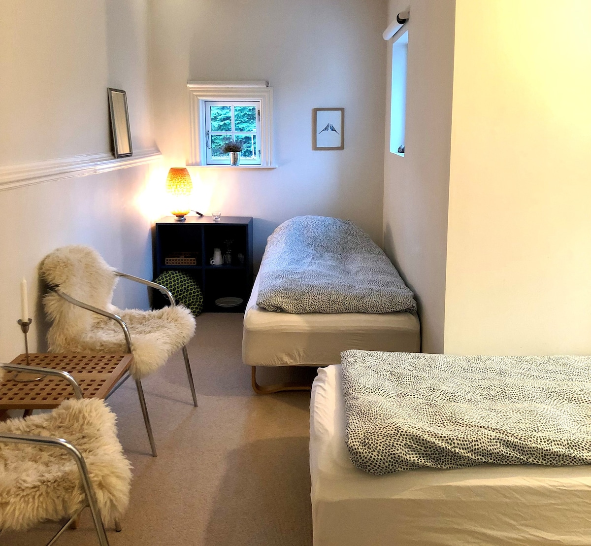 Habitación cómoda y tranquila con una configuración de cama flexible: doble o dos individuales, camas de elevación de alta gama para un sueño cómodo. Incluye un escritorio y un armario grande. Hay un dormitorio adicional disponible para niños o amigos (nunca se alquila a otros huéspedes). Disfruta de alojamiento y desayuno, con opciones de cena ocasionales. La habitación y el baño privado se encuentran en un pasillo aislado, utilizado solo por ti. No se permite fumar ni mascotas. Alquiler de bicicletas cerca. A 5 minutos en coche/autobús de la playa. A 25 minutos en coche/tren de la estación central de Copenhague.