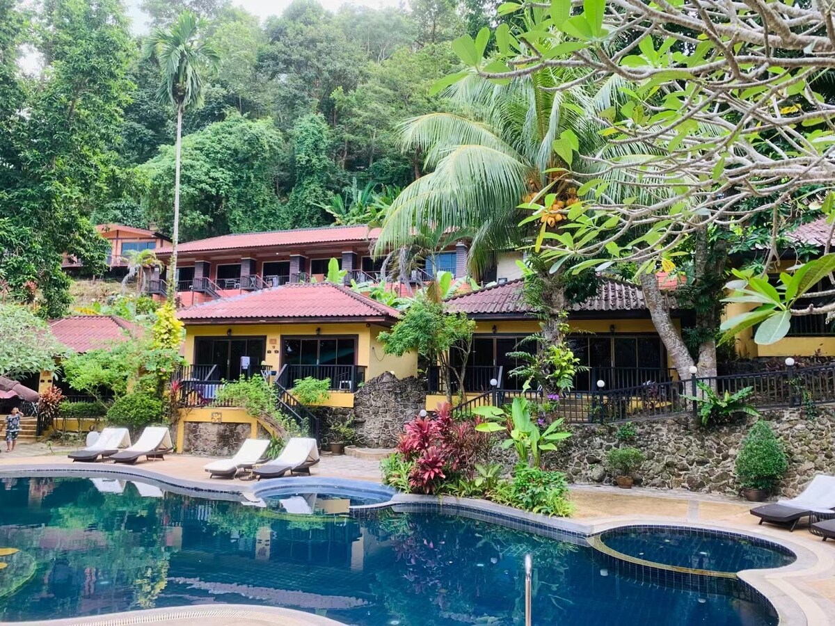 La casa está en medio del bosque de montaña cerca de Padang Beach, Phuket, y en comparación con la bulliciosa y animada calle comercial de playa, la montaña es tranquila, la naturaleza y hay una variedad de árboles y flores en el bosque de montaña, con arroyos y estanques de peces, perfectos para relajar la mente.Pero su ubicación también es muy conveniente, a poca distancia de la playa, los restaurantes y las tiendas. Recogida en el aeropuerto y otros servicios de automóviles por un cargo adicional