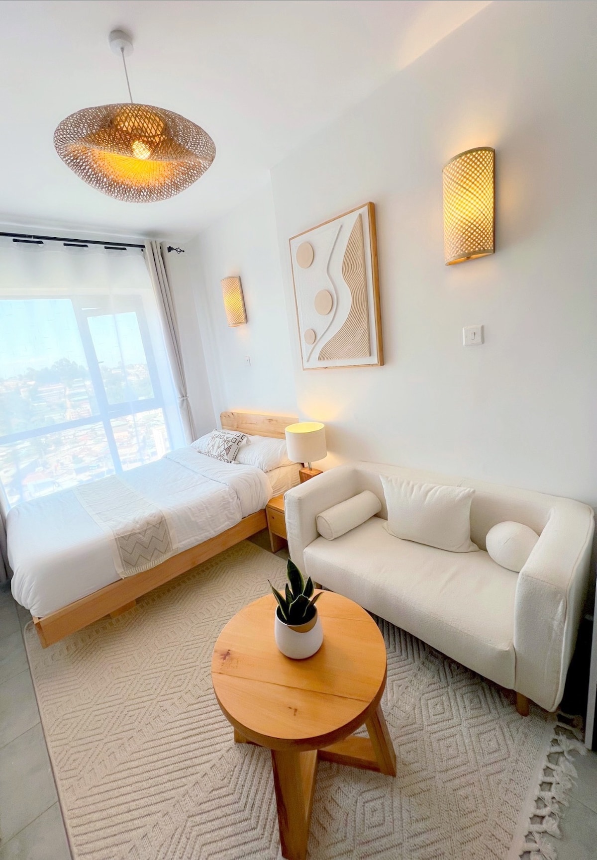 Escape to this modern boho studio on the top floor with stunning views at Tsavo Step-up, Riruta just 10 mins from Junction Mall, Carrefour and Naivas Supermarket. Amenities include a high-speed lift, free parking, 24-hr security, a rooftop restaurant, a laundromat, a salon and a convenience store on the ground floor. Enjoy fast Wi-Fi, free Netflix, complementary tea, coffee and water, an instant shower and a fully equipped kitchenette with a cooker. It’s perfect for solo guests or couples.