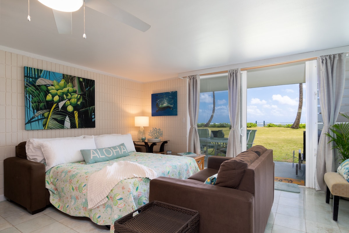 ¡El nuevo aire acondicionado de ventana de 18.000 BTU ya está en la sala de estar! Aloha🏝 . Bienvenido a mi apartamento de un dormitorio recientemente renovado (nueva ducha a ras de suelo y nuevos suelos de baldosas) situado en la hermosa playa de Punaluu (Hauula, Hawái). Hay un lanai con una vista parcial al mar donde puedes comer o tomar un cóctel y relajarte. La cocina es de concepto abierto con una bonita zona de mostrador para las comidas y es conveniente/cómoda para trabajar a distancia. Hay algunos equipos de mar disponibles para usar (tablas de body, aletas, etc.).