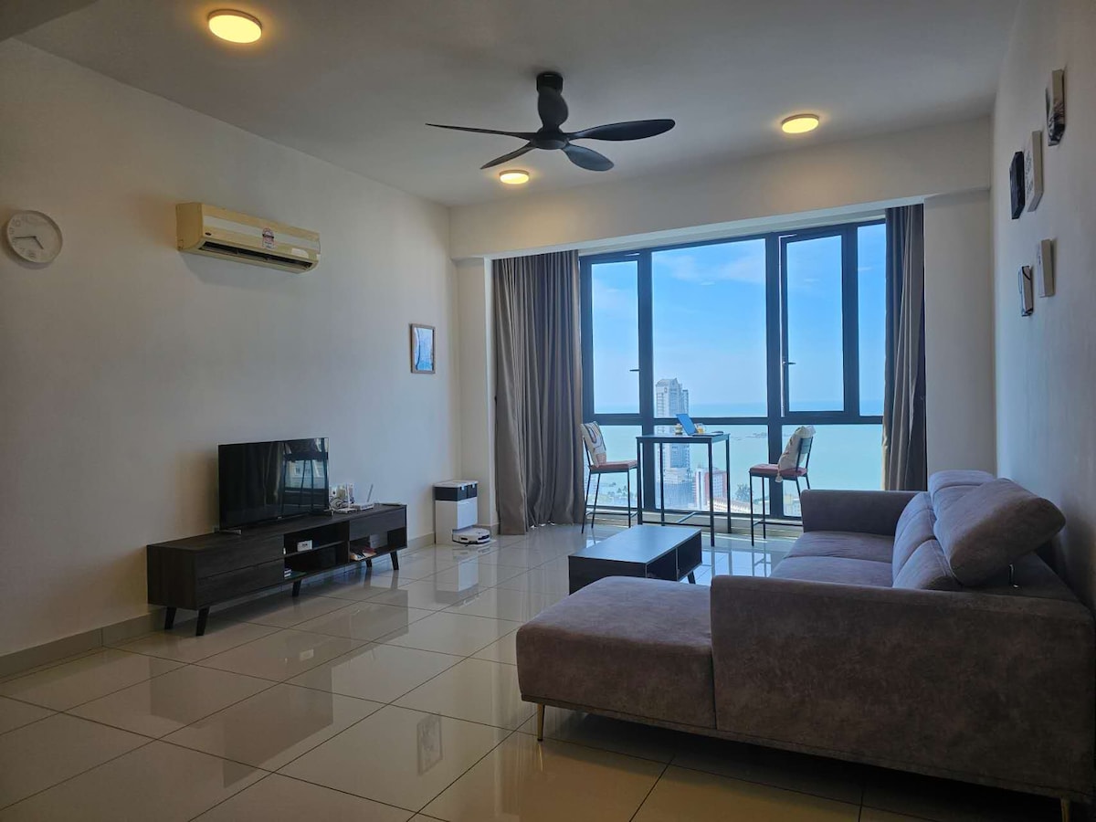 Free WiFi, equipped with smart lock, water heater, air cond, microwave and water filter that can drink hot and cold water immediately. Free 2 parking places as well. Very near to Karpal Singh, 5 minutes to Georgetown with great seaview and cityview. You will be able to see the Penang bridge, seaview, Komtar from this unit. Located at 36th floor as well. If you need anything, can chat me, because I stay just nearby.