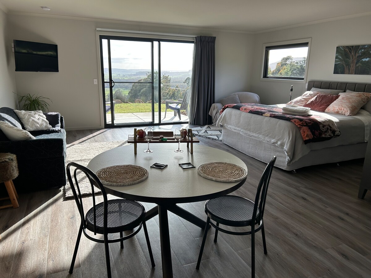 On the bank of the Don River, just 15 minutes from Devonport, the two bedroom unit attached to our home has a private entrance, two queen beds with an extra single bed and/or cot on request. If reserving for 1 or 2 guests, only one bedroom will be accessible unless communicated at the time of booking. The unit has fridge, microwave, coffee machine and dining setting. BBQ in the undercover courtyard for guests. Continental breakfast included. There is no kitchen sink so we do the dishes!