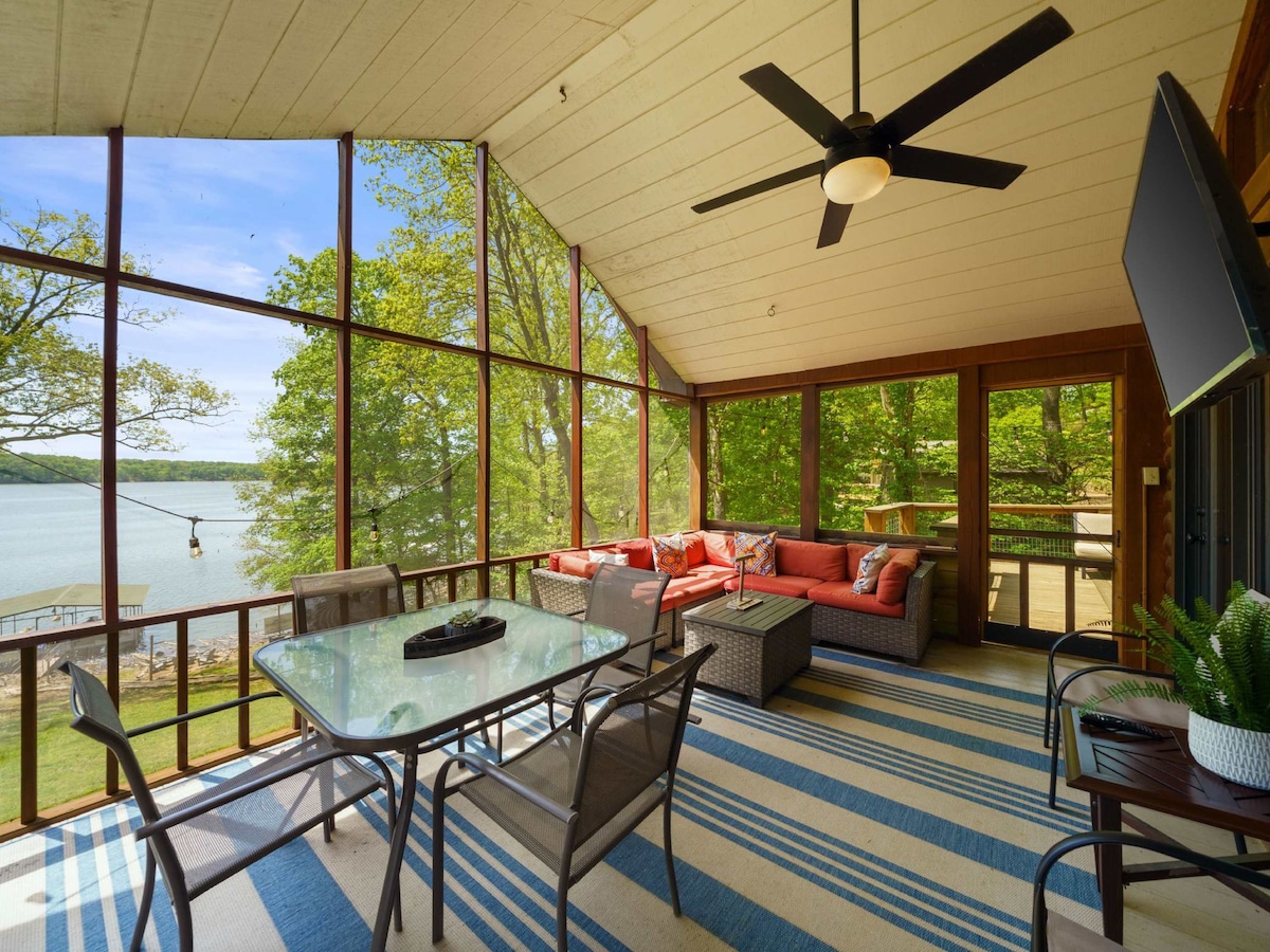 Nuestra casa del lago es perfecta para familias. Tiene 5 dormitorios, 4 habitaciones con cama tamaño queen y 1 litera con capacidad para 6 personas. La casa está perfectamente dividida con dos dormitorios, 1 baño y sala de estar arriba y 3 dormitorios adicionales, 1 baño con sala de estar adicional abajo. Patio cubierto con vistas al lago y TV. Amplia terraza parcialmente cubierta con escalones que conducen al muelle. Gran área de fogata para smores, sección adicional al aire libre con mesa de fogata para descansar. Pregunta sobre la disponibilidad de alquiler de pontones.