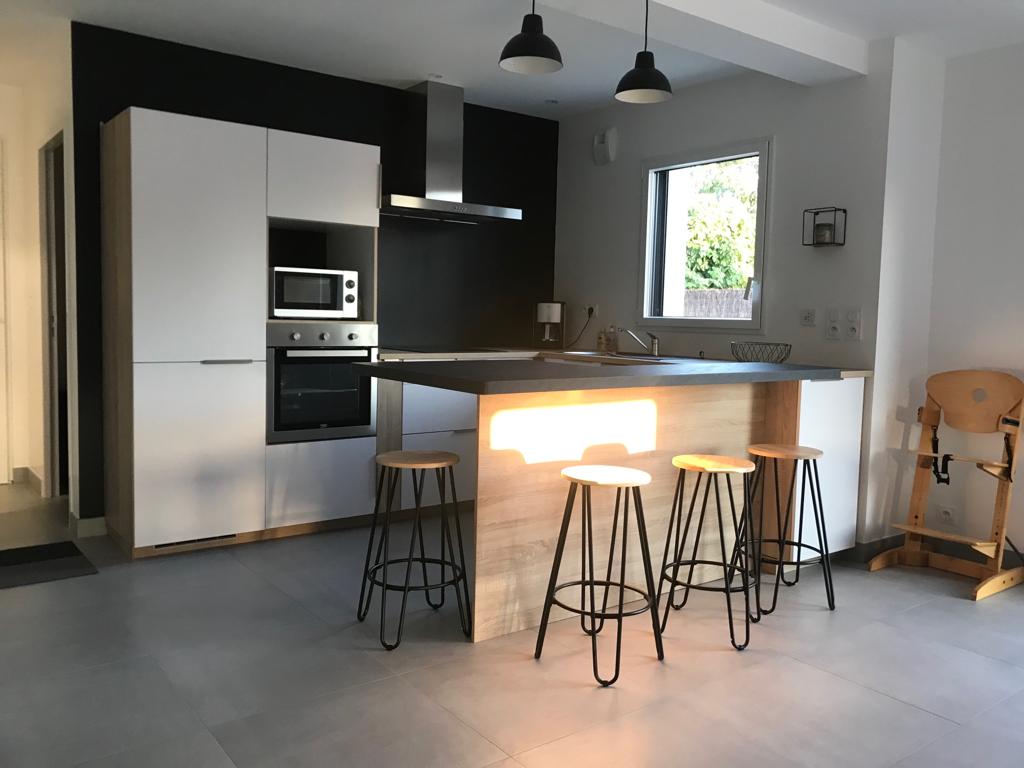 Casa unifamiliar nueva en el encantador pueblecito de Erdeven, a 15 minutos a pie de las playas. Superficie: 140 m² con gran terraza de madera orientada al sur en una parcela de 530 m2. En la planta baja: cocina equipada, gran salón-comedor (mesa para 10 personas) con ventanales en la terraza, lavadero con congelador y lavadora/garaje, WC, 1 dormitorio cama doble con su baño privado. Planta superior: 3 habitaciones grandes, 1 aseo separado, 1 baño. (Ropa de cama no incluida)