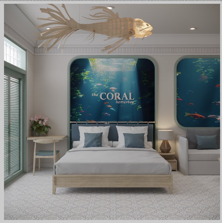 Habitación tamaño queen con temática Lekima Blue cerca de la playa