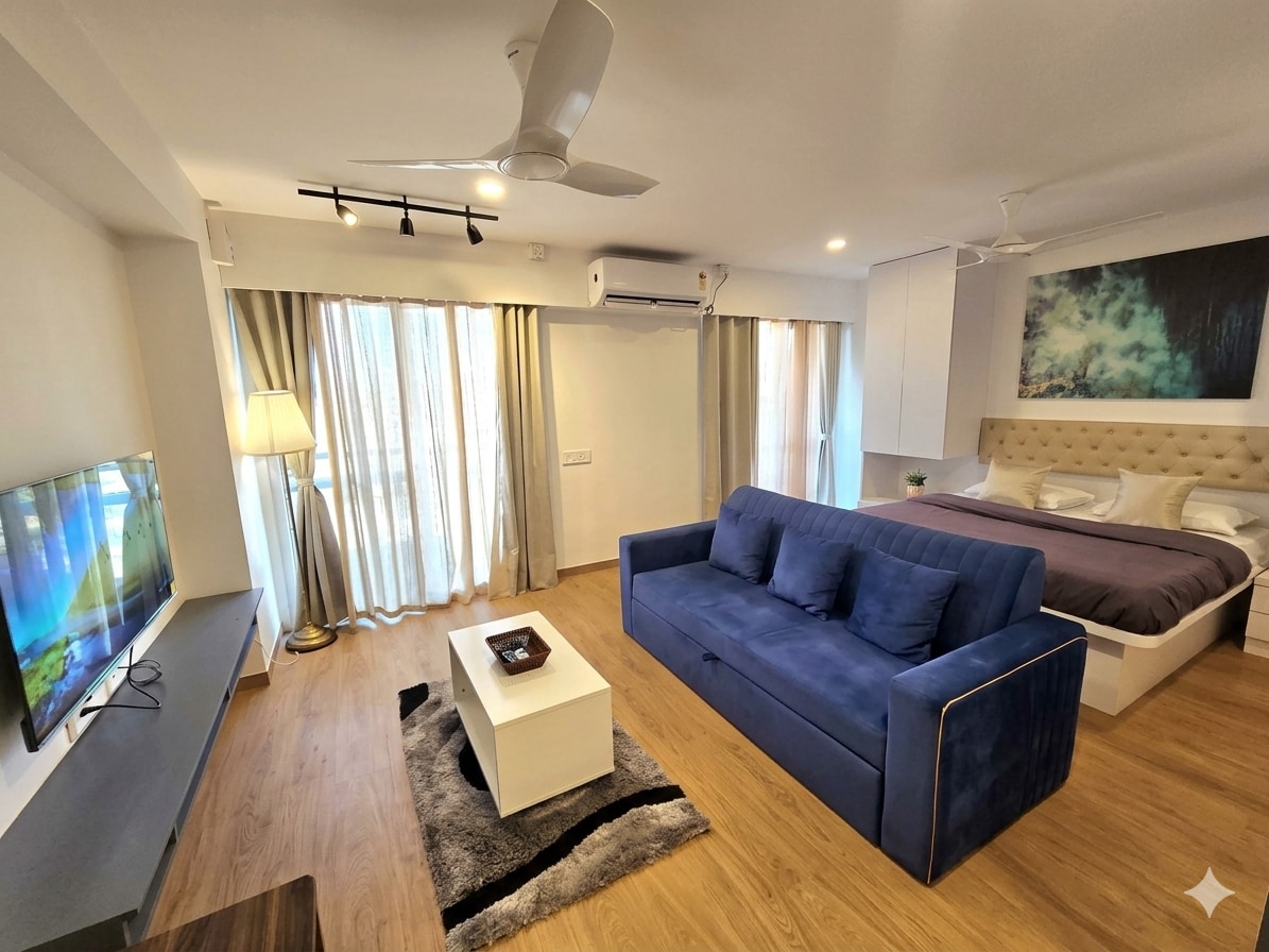 Clean Modern Studio in Gera’s World of Joy – Near WTC, EON & Barclays | WiFi | AC | Balcony 🛏️ Studio Highlights: • Queen-size bed with clean linens • AC, high-speed WiFi, Smart TV • Private balcony on higher floor • Equipped kitchenette (microwave , induction, utensils) • Modern bathroom, geyser. 🏢 Society Amenities: • Swimming pool, gym, clubhouse (resident access only) • Open children’s play area, jogging track, tennis court • 24/7 gated security, elevators, power backup
