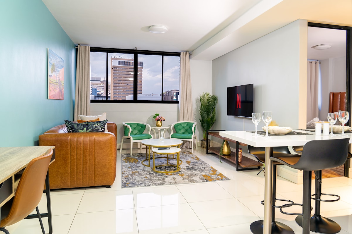 La Belle Luxury Suites offers two executive luxury apartments located in the same building in Windhoek CBD. The apartments can be booked individually or together, subject to availability, making them ideal for business travellers, families, or small groups. Each apartment is modern and fully furnished, with fast Wi-Fi, a fully equipped kitchen, and comfortable living spaces. Guests enjoy access to a rooftop pool, gym, and secure parking. Book now for a comfortable and refined city stay.