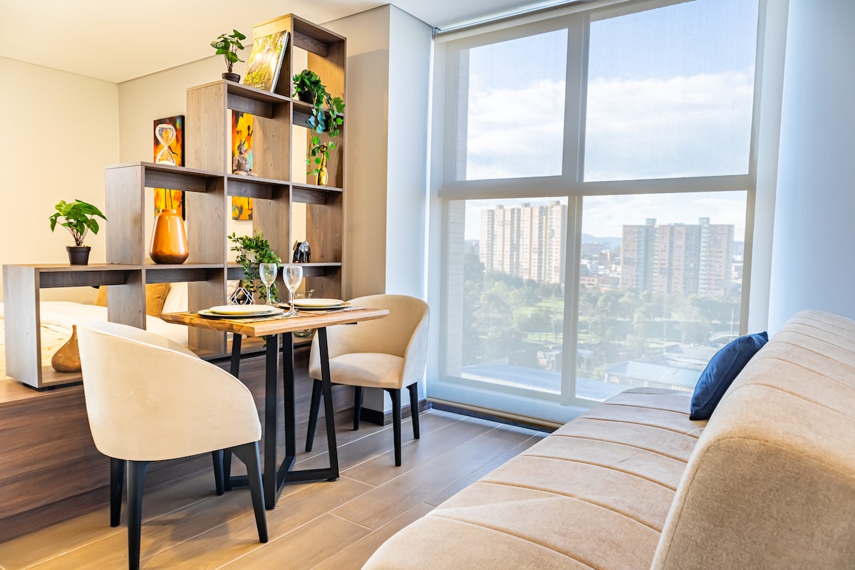 Acogedor e iluminado apartamento en ubicación central y estratégica de Bogotá. Totalmente equipado y con todas las comodidades para sentirse como en casa. Ideal para viajes de negocios, turismo, parejas o amigos que quieren alojarse en un loft moderno y espacioso. A pocos minutos del Movistar Arena, Estadio el Campin, Parques, Aeropuerto, Centros Comerciales, Embajada Americana, Restaurantes y Zonas Turísticas. Apartamento esquinero en piso 9 con hermosas vistas. Edificio totalmente nuevo