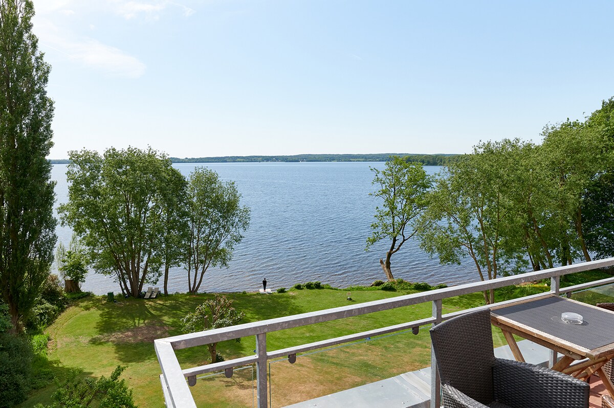 Suite junior de 50 metros cuadrados: vista lateral al lago con cama matrimonial y gran balcón con vista lateral al lago Plöner. Diseño: el desayuno Werner Aisslinger se puede reservar en el lugar.