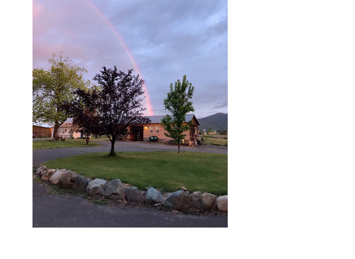 La Carriage House se encuentra en Kelly's Farm, a cuatro millas de la ciudad de Ashland y a menos de dos minutos de la autopista 5. Esta casa de dos pisos tiene 440 pies cuadrados con dos puertas corredizas de vidrio que ofrecen una vista de 360 grados de las montañas y la puesta de sol. Hay una terraza arriba y abajo, una parrilla de propano y la cocina está totalmente amueblada, dos quemadores, horno de encimera y arrocera, entre otras cosas. Preparada para tres personas usando dos camas. Los perros son bienvenidos, pero no aceptamos gatos.