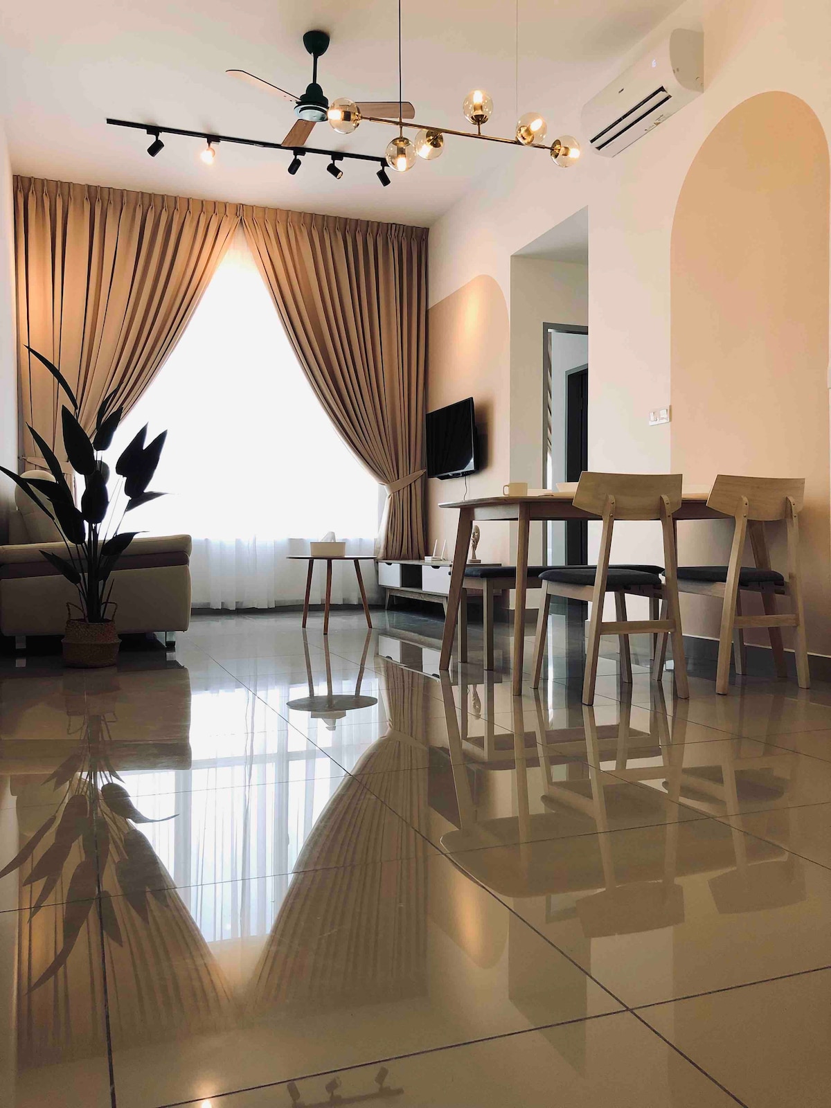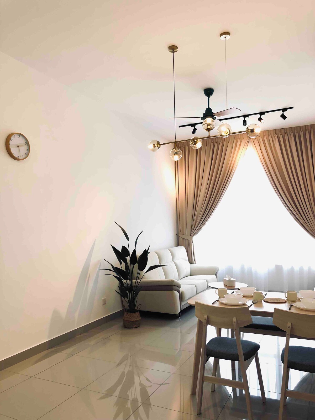 Max:7 Adult 1 Car Park | Muslim-Friendly | Large balcony for sunset views Bedroom Setup -Bedroom 1: Queen bed, A/C, fan, attached bathroom -Bedroom 2: Queen bed, A/C, fan -Bedroom 3: Single bed, A/C, fan #Extra single bed available. Amenities -WiFi+TV+Netflix(May log in with personal acc) -towels -washing machine -iron & board -refrigerator -microwave -rice cooker -water filter -plates & cutlery. Facilities -Swimming pool -gym -badminton court -park No smoking & pets RM50 refundable deposit