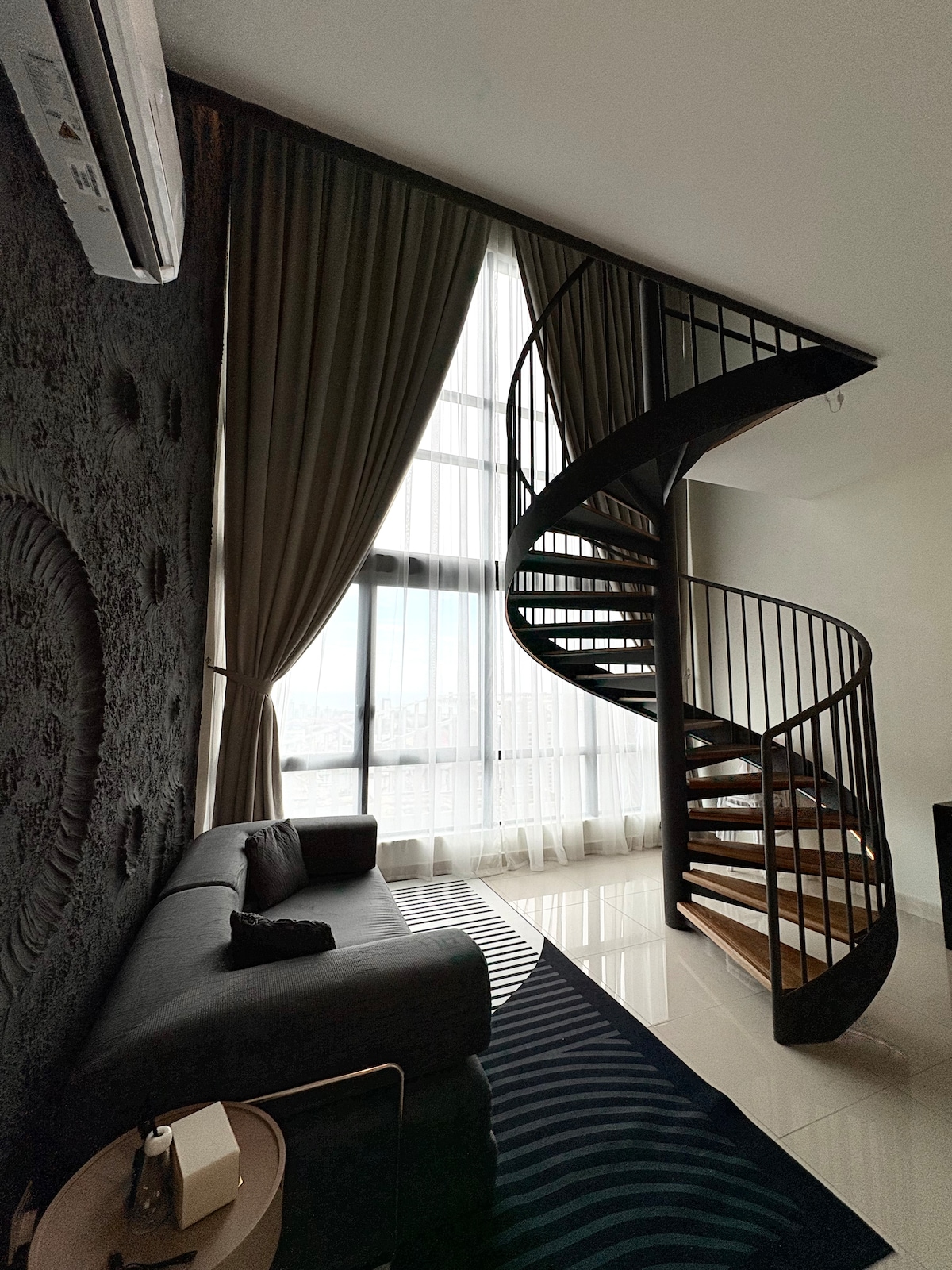 Nuestra unidad es un elegante loft dúplex con temática lunar diseñado para la calma y la comodidad. Tiene capacidad para 4-5 personas con 1 cama tamaño «king» en la planta baja, 2 individuales en la planta superior y un sofá cama en el salón. Con tonos oscuros, una escalera de caracol y una iluminación ambiental brillante, es perfecto para parejas, amigos o familias. La unidad se encuentra en The Apple Residence, cerca de Jonker Street (1 km), con fácil acceso a comida, transporte y ambiente urbano: tu escapada tranquila por encima de la ciudad te espera.