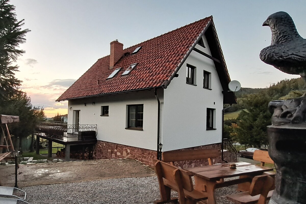 Nuestra casa de madera de nueva construcción se encuentra al pie del bosque y del parque Owl Mountains junto a los senderos turísticos. Es la elección perfecta para las personas activas que quieren alejarse del bullicio de la vida de la ciudad.