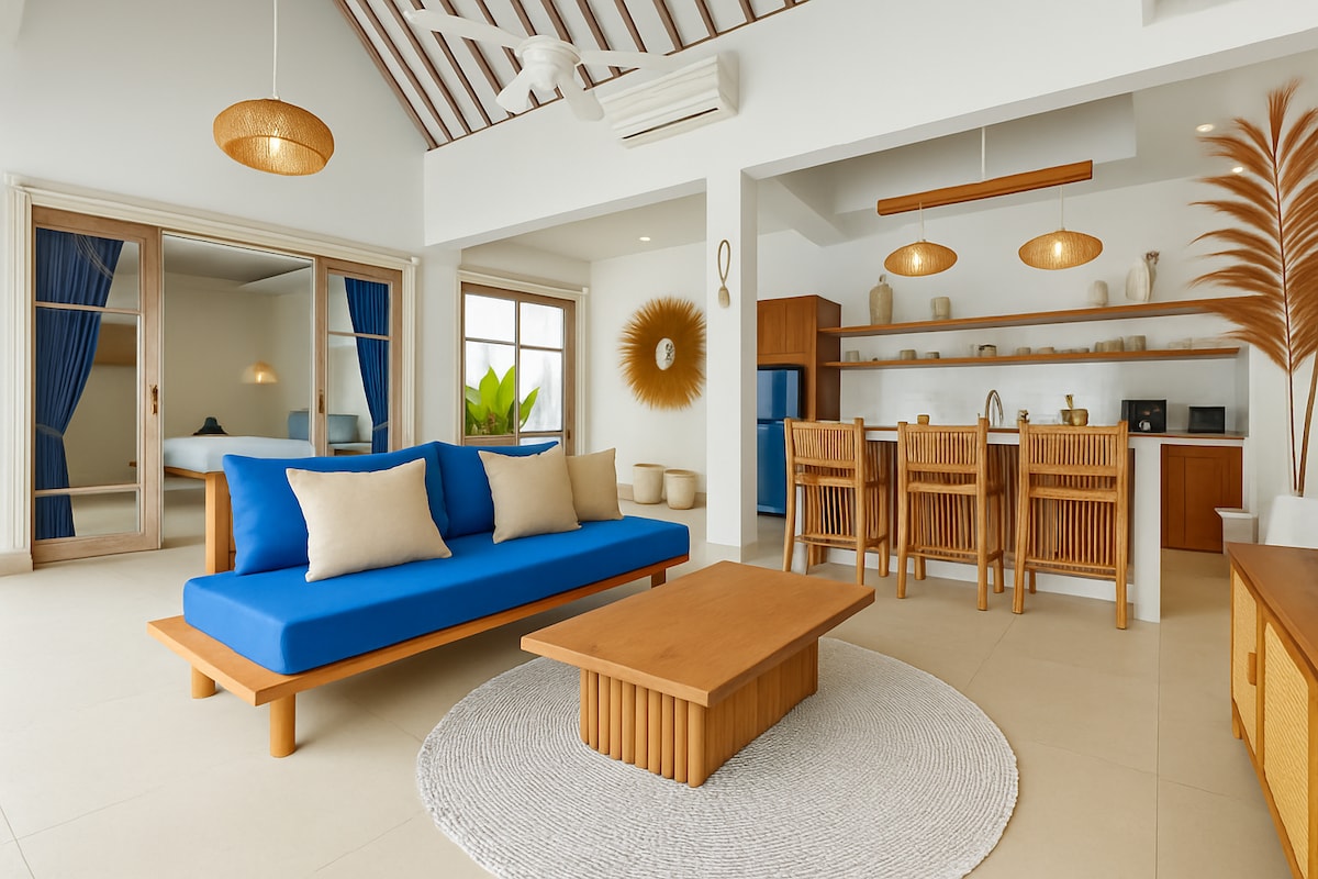 NAU NUSA VILLA es una VILLA PRIVADA. Consta de 4 edificios (3 dormitorios + 1 cocina y comedor). Todas las habitaciones son amplias y están equipadas con sofá, mesa de centro y TV inteligente. Todos los baños están equipados con bañeras y ducha semiexterior con acceso directo al exterior. No ofrecemos desayuno, pero el huésped puede cocinar en nuestra cocina y tenemos personal para ayudarte a comprar algo.