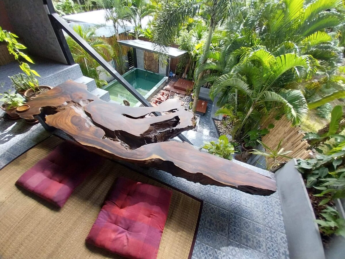 Esta es una acogedora casa de retiro que fue diseñada y construida con amor y atención al detalle por tu anfitrión. Los materiales, colores, texturas y la luz se combinan cuidadosamente para crear un ambiente armonioso y tranquilo, acariciado por la suave brisa del océano siempre presente. La casa está rodeada de naturaleza, pero a solo 2 minutos en coche del centro de Srithanu (la zona espiritual). La casa tiene agua caliente y conexión wifi de alta velocidad. El aire acondicionado no está disponible intencionalmente y no es necesario gracias a su diseño inteligente.