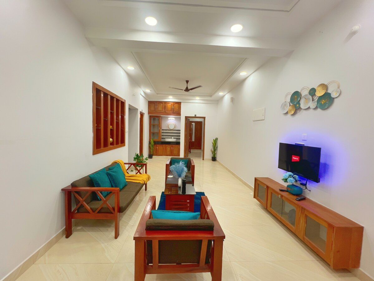 Disfruta de la comodidad y el estilo en nuestro apartamento con servicios de 2BHK en Kochi, parte de una cadena hotelera de confianza. Diseñado con un toque estético, cuenta con una acogedora sala de estar con un sofá moderno, una cocina totalmente equipada, una lavadora y una zona de trabajo dedicada. Las amplias habitaciones, todas con aire acondicionado para su comodidad, cuentan con elegantes baños. Disfruta del entretenimiento con Netflix, YouTube y mucho más en el televisor LED de gran tamaño. Perfecto tanto para estancias cortas como largas, combina la calidez hogareña con un servicio de categoría hotelera.