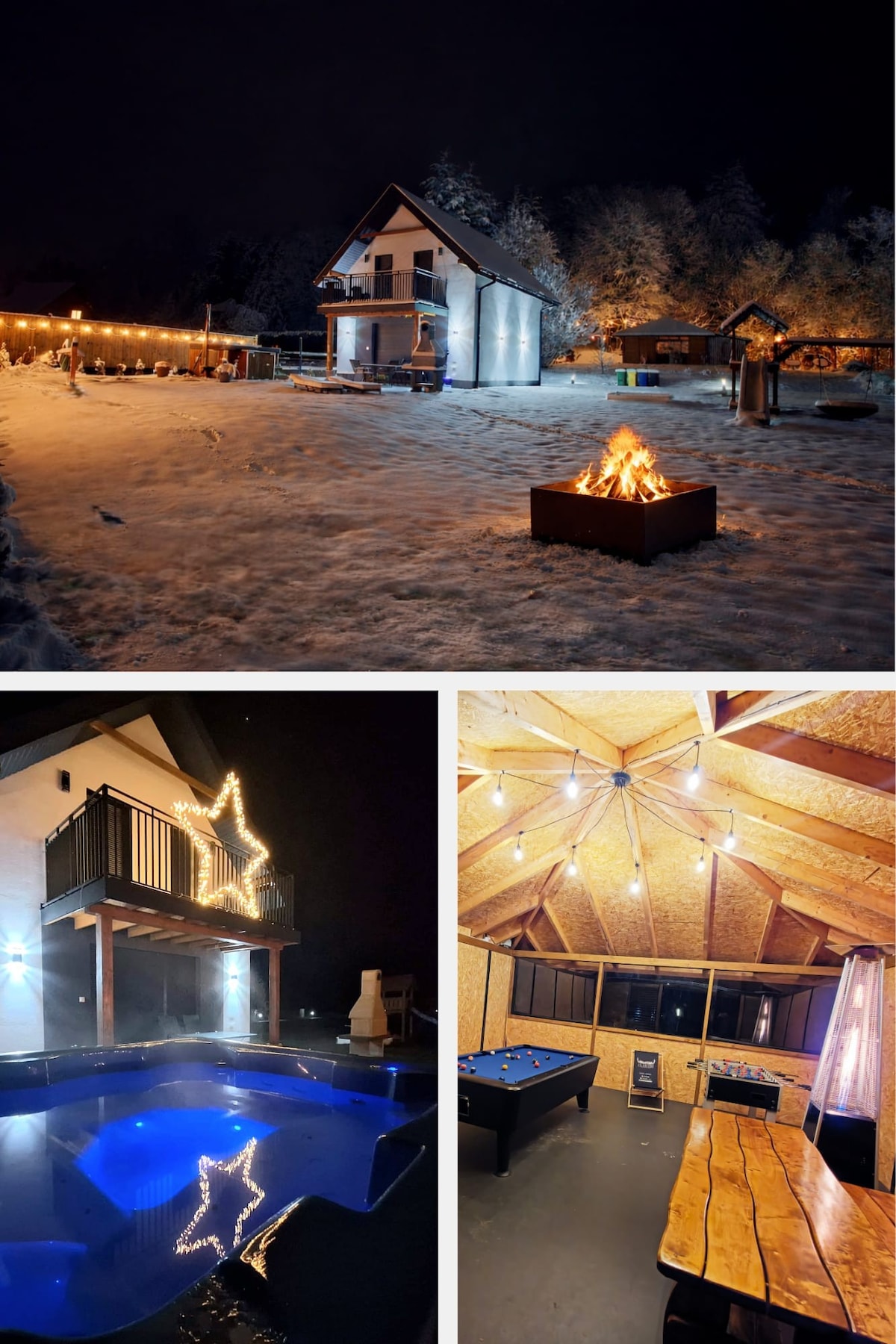 Construido con nuestras propias manos desde los cimientos hasta los muebles interiores hechos a mano. Alrededores de la casa arreglados para su comodidad: terraza con tumbonas y bañeras para bañarse en verano, bañera con agua caliente para los días de primavera y otoño, asientos al aire libre en una terraza parcialmente cubierta junto a un pequeño estanque, espacio para hacer barbacoas o asar. Y vegetación plantada por todas partes. Quería que los huéspedes experimentaran la calidad y la comodidad a primera vista y en su propia piel.