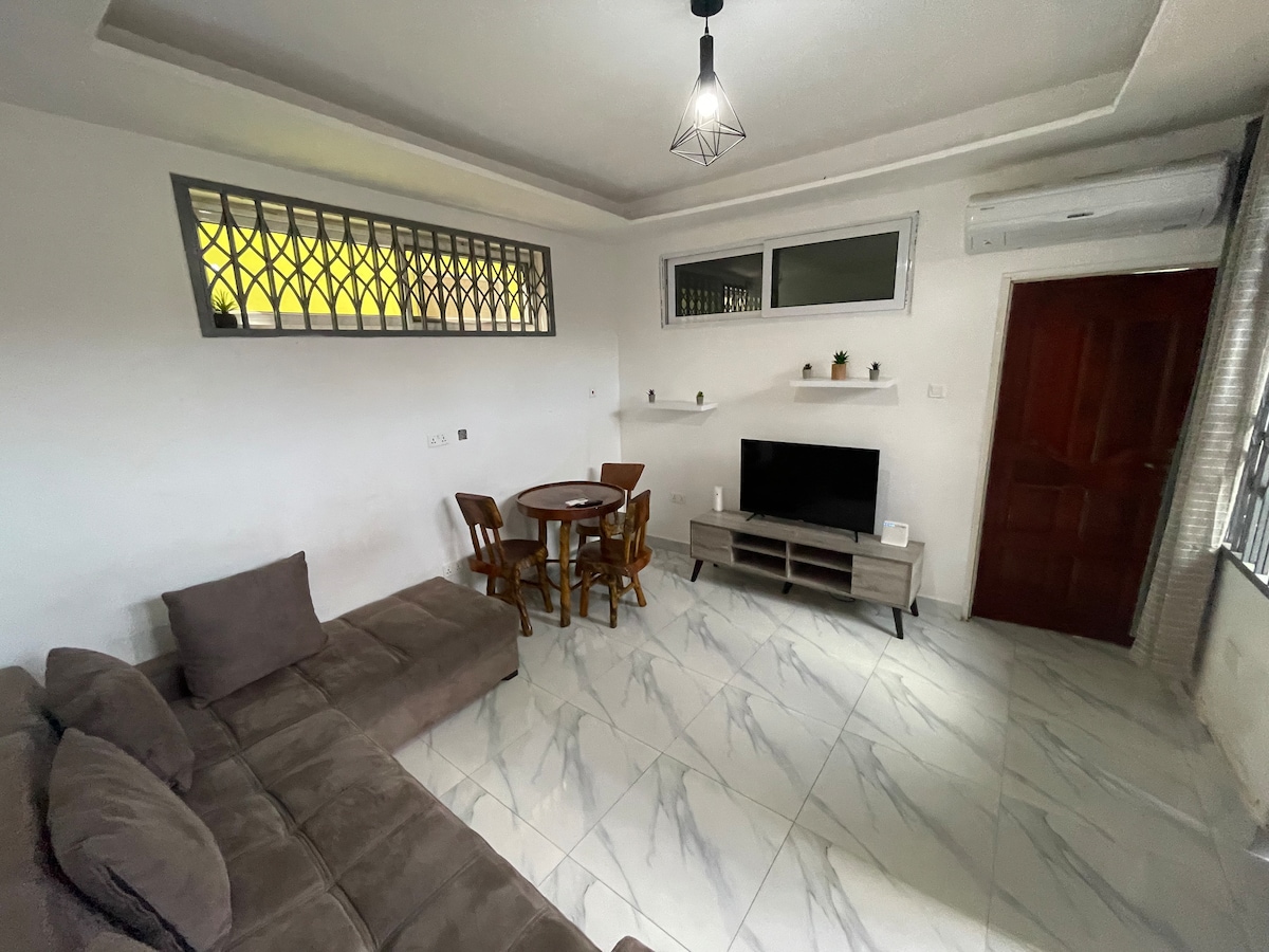 Space: A warm smoke-free studio apartment, beautifully furnished with a clean bathroom. It comes with free high-speed Wi-Fi, Air conditioning, a 55-inch Smart TV and a fully equipped kitchen with a washer. The unit has a balcony with outdoor furniture for your relaxation. The Location: Cozy studio apartment across from Accra mall. Only 10 mins drive from the Int'l airport. The property is very convenient to shops, restaurants, clubs, pub/lounges, Labadi beach and interesting places.