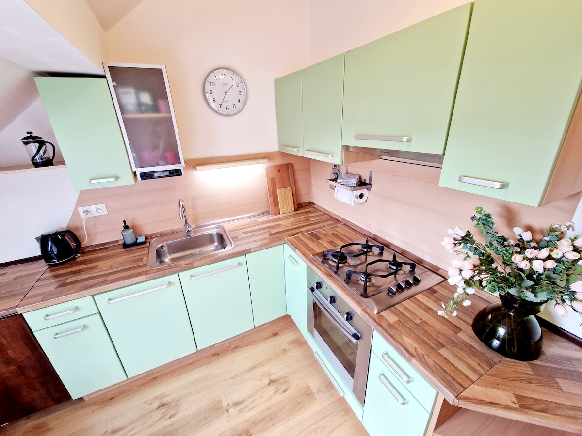 Al lado del apartamento hay una panadería familiar El aeropuerto de Kosice está a 5 minutos en coche Gran parque con estanque y patos a solo 5 minutos a pie. En el parque puedes encontrar un parque infantil y una cafetería-heladería para descansar un poco :) También puedes alquilar una bicicleta o un patinete.