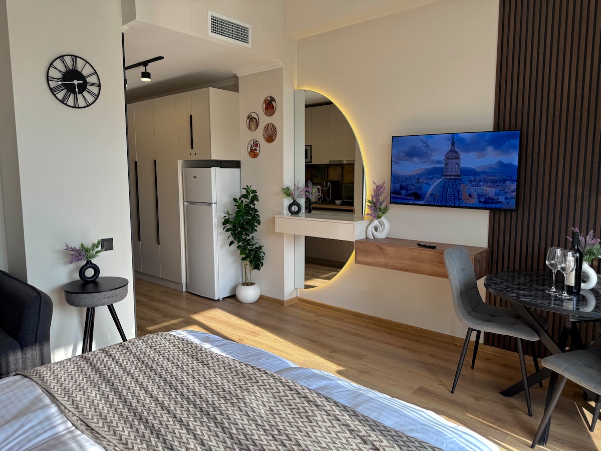 Haz de esta tu próxima estadía encantadora agregándola a tu lista de deseos haciendo clic en❤️. • Llegada autónoma las 24 horas, los 7 días de la semana • Edificio recién construido - Distribución espaciosa • Ubicado en el último piso. • Ascensor • Balcón francés con vistas panorámicas. • Acceso a la piscina y a la sauna (cargo adicional) • Calefacción centralizada y aire acondicionado • Muebles interiores cómodos • WIFI de alta velocidad y TV inteligente (+Netflix) • Cocina totalmente equipada • Cama tamaño queen + sofá cama • Ropa de cama y toallas limpias • Productos de baño de lujo