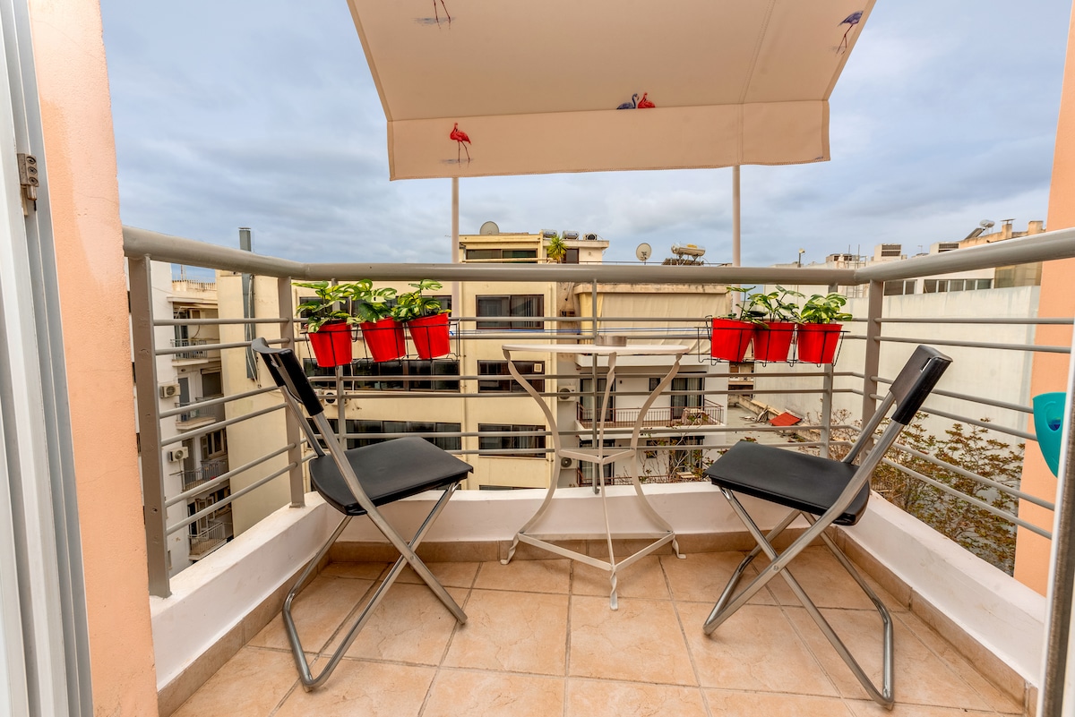 Spacious and stylish 95sqm apartment in the heart of Athens! It offers 2 bedrooms with double beds, a fully equipped kitchen, washing machine, dryer, dishwasher and a cozy living room with sofa bed, 50’’ TV, 5.1 HCinema system and optical line 300 Mbps internet. Enjoy silent A/C throughout and a 25sqm balcony with dining area and lounge sofa – perfect for warm summer nights. Just a short walk from all major sights, shops and restaurants, making it the ideal base for your Athens stay!