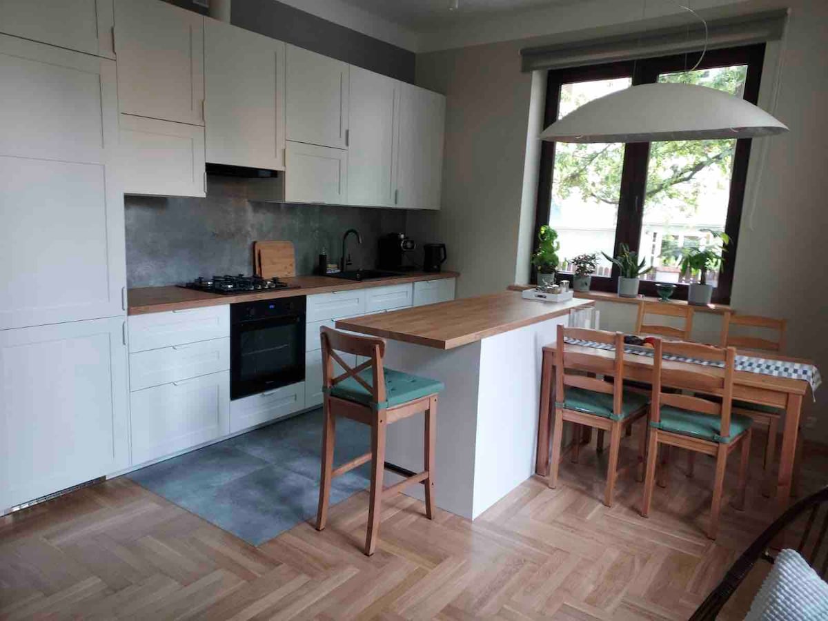 Cozy and private apartment near Vistula River. Great Location & Super Easy To Get Around: - Jewish District Kazimierz in 10min (tram) or 20min walk in park along the Vistula River - Old town (Stare Miasto) 15min (tram) or 30 min walk - TAURON Arena 10 min walk Accommodation for 7 people: 1 room with queen size bed, 1 room with 3 single beds and living room with convertible sofa. Green neighborhood, beautiful garden, option for BBQ, free parking space. We are pet-friendly :)