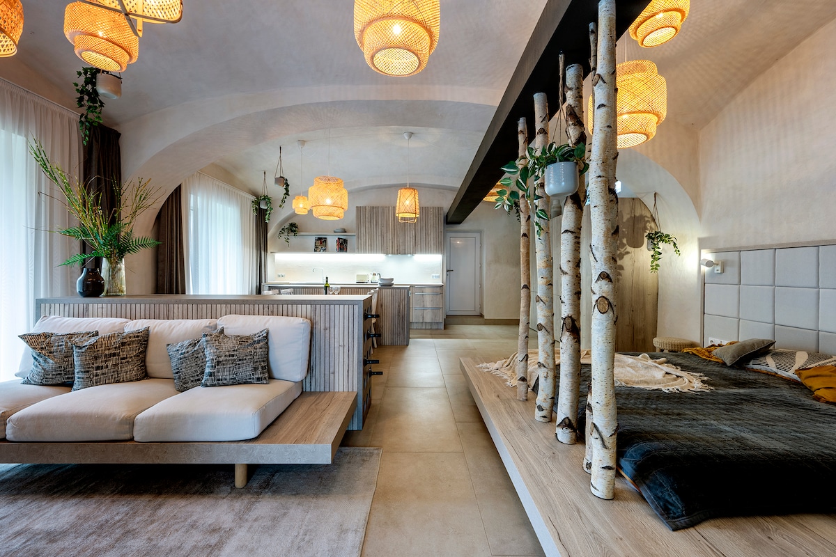 Užijte si pobyt v prostorném studiu, které kombinuje přírodní materiály, moderní vybavení a útulnou atmosféru. Stylové ubytování o 67 m2 s plně vybavenou koupelnou a kuchyní, kosmetikou L'occitane, soukromou teráskou a se sousedními tenisovými kurty za rohem. Manželská postel pro 2 osoby, s možností přidání 1-2 přistýlek. Přistýlka je řešena kvalitní matrací s paměťovou pěnou značky Dormeo.