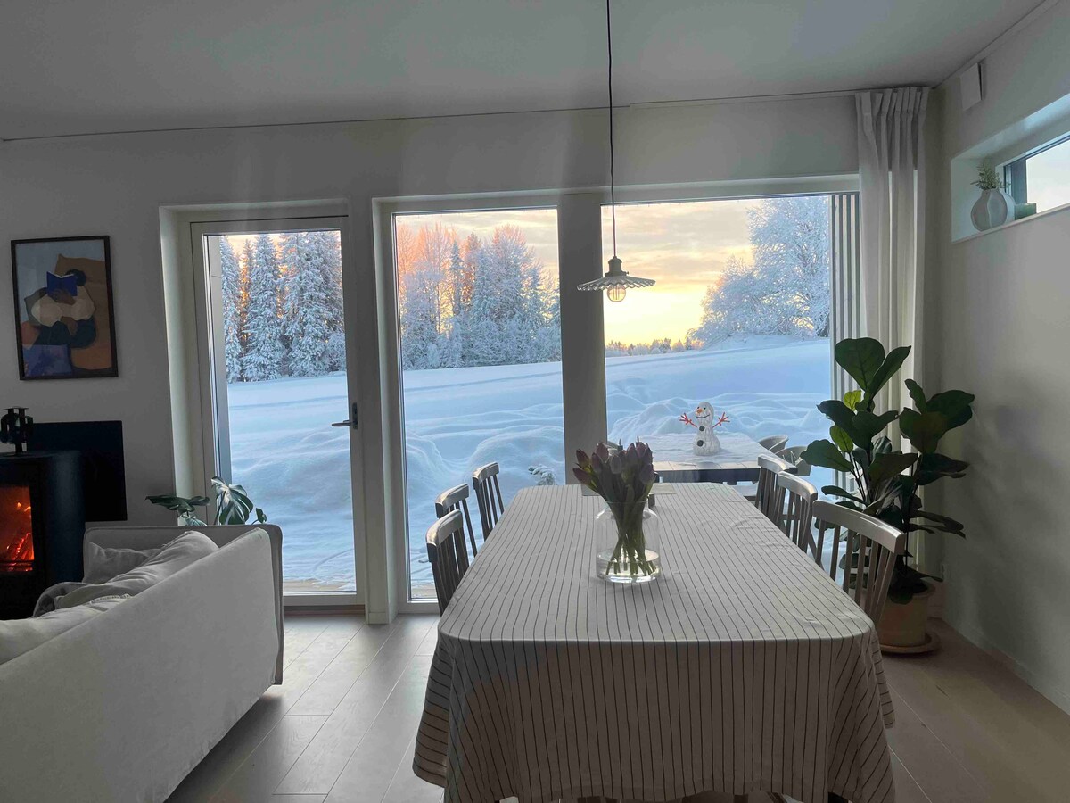 Disfruta de una experiencia elegante en este lugar céntrico. Amplio porche y encantador jardín para relajarse. Todas las habitaciones tienen camas cómodas. La cocina está amueblada en su totalidad. (Las toallas y la ropa de cama están incluidas) Espacio suficiente para pasar unas vacaciones. El pueblo de Föllinge cuenta con todos los servicios básicos: Fika fresca y café, sabrosa pizza. El supermercado está a la vuelta de la esquina. Estaciones de esquí en las inmediaciones. Un gran lago para pescar,nadar y navegar .