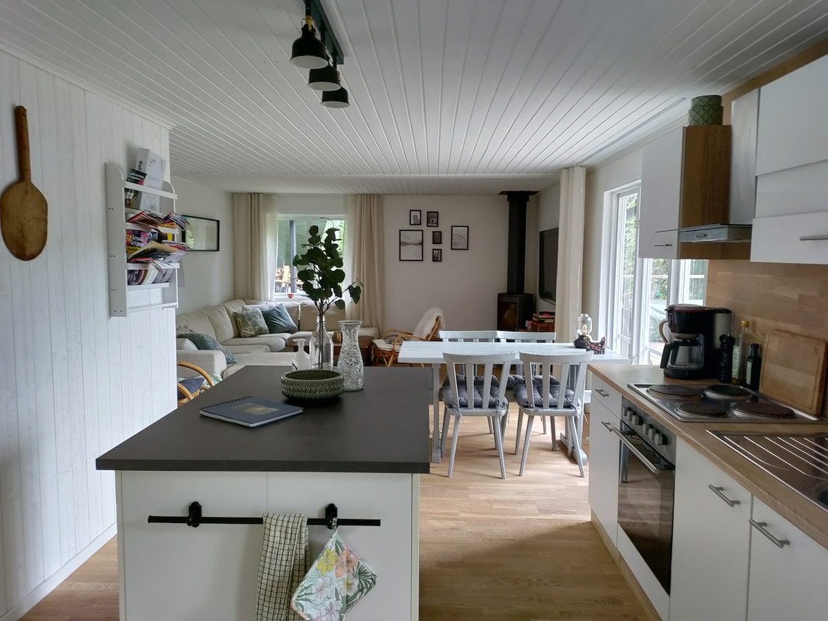 Casa de vacaciones de nueva construcción (2020-2021) ubicada en un cabo sin vecinos a la vista. Pequeña playa privada poco profunda con barco y motor eléctrico. Estufa de leña en el salón. Buena pesca con zander, perca, lucio, etc. Buen wifi. Sauna. Hongos y bayas. Estacionamiento grande privado en la parcela. Actividades cercanas : Isaberg Mountain Resort, High Chaparral, Store Mosse National Park, Ge-Kås Ullared, Knystaria pizzeria , Knystaforsen (guía blanco) Tiraholms Fisk Aquí vives lujosamente pero al mismo tiempo con la sensación de «volver a la naturaleza»