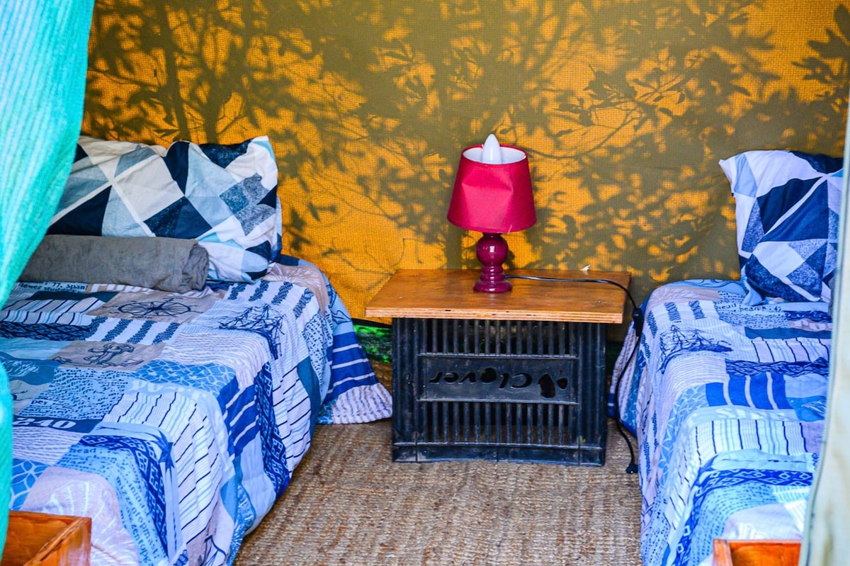Nuestras 3 tiendas de campaña de safari cuentan con dos camas (individuales o dobles) hechas de palets reciclados con ropa de cama cómoda, toallas limpias, ventilador y almacenamiento. Una terraza a la sombra para relajarse. El baño compartido y las instalaciones de cocina están disponibles para tu comodidad.